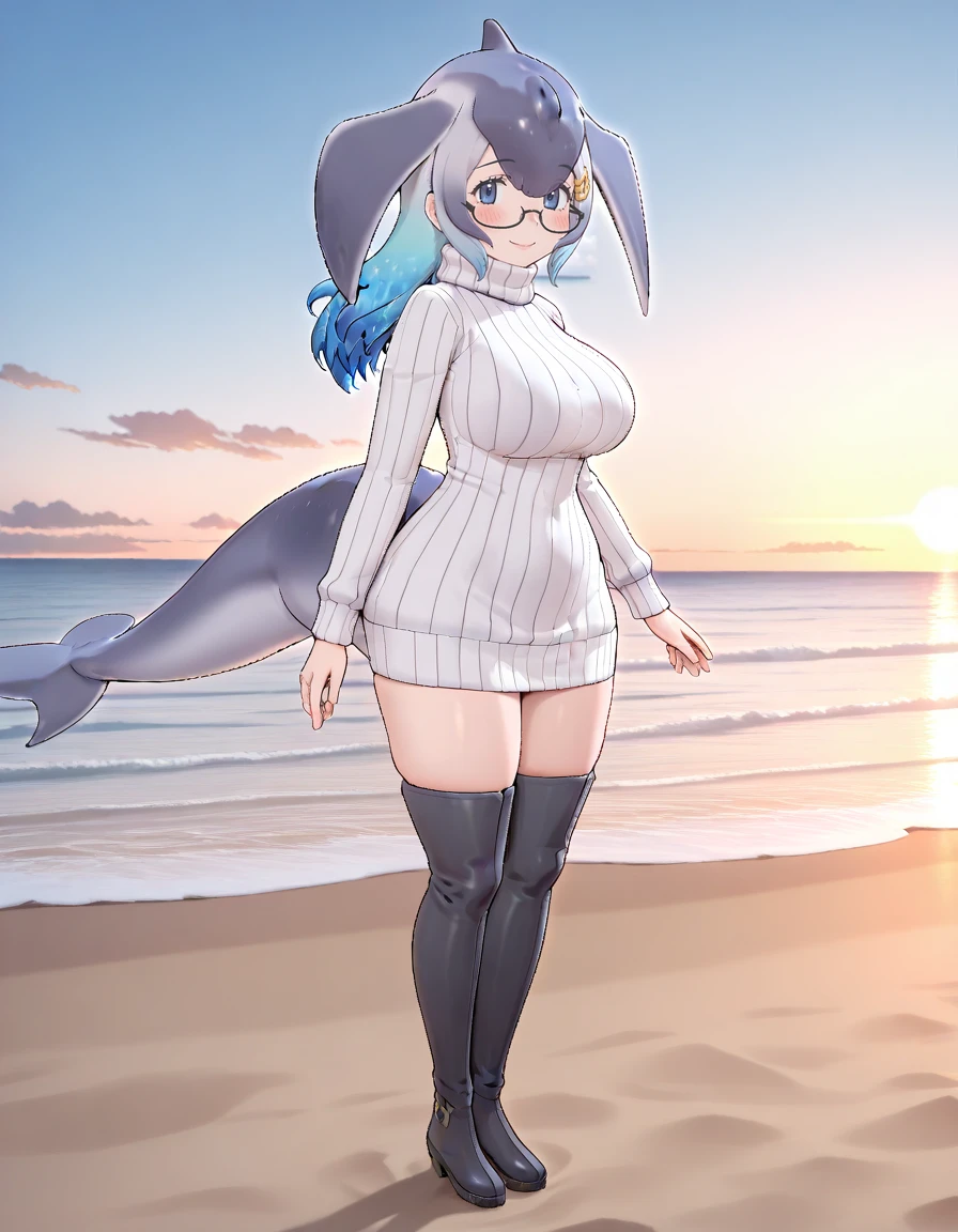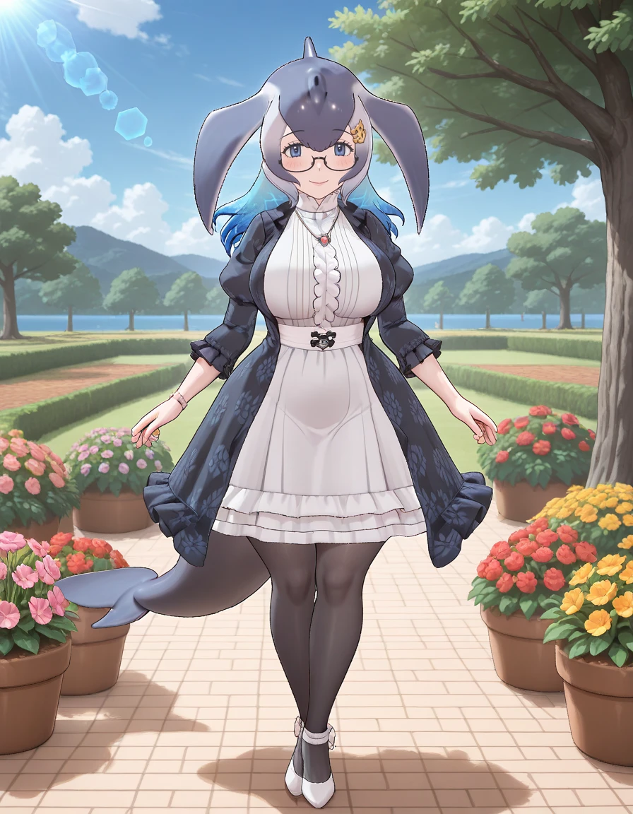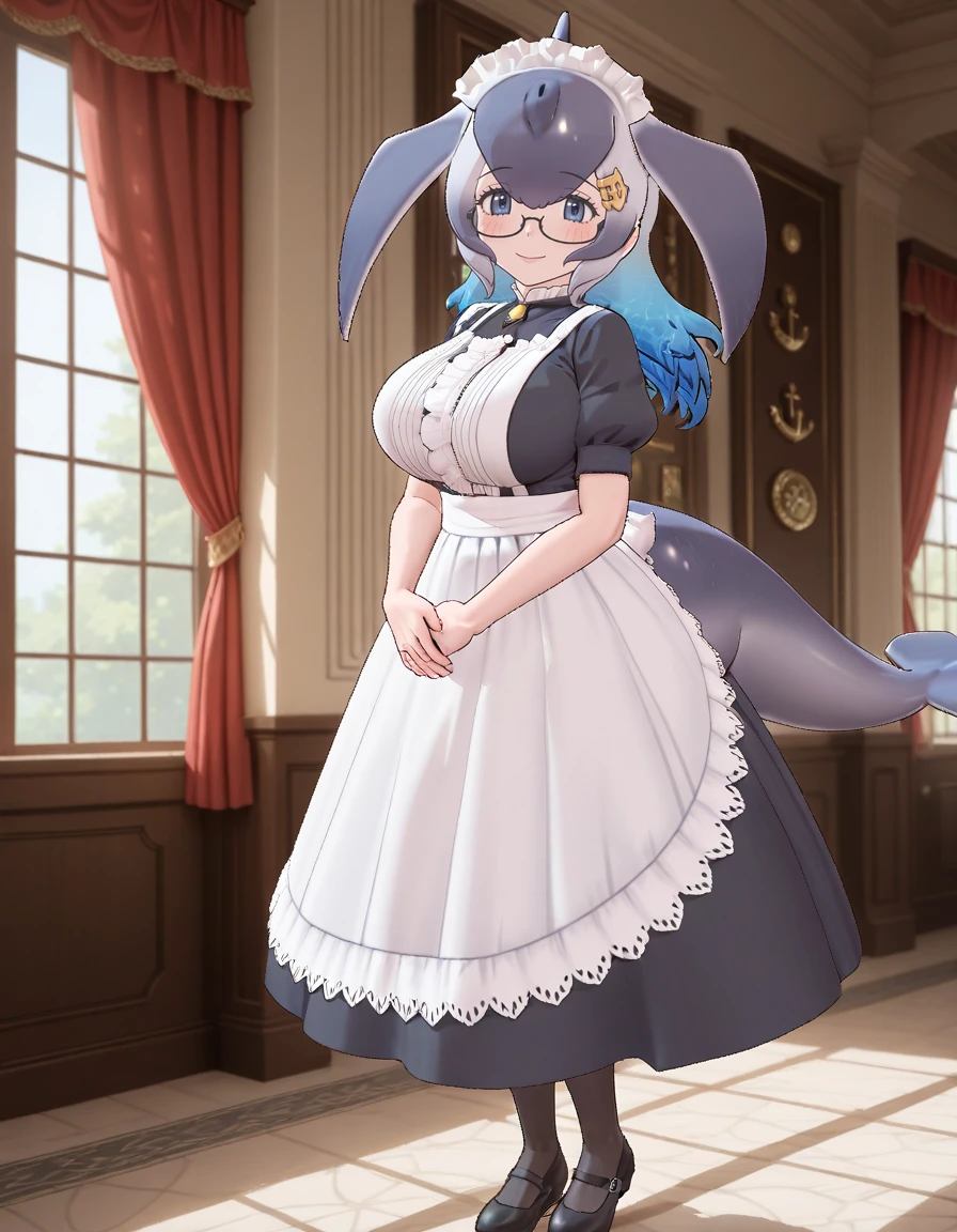 [Appearance] blue whale \(kemono friends\), whale girl, cetacean tail, tail, extra ears, fins, head fins, multicolored hair, two-tone hair, gradient hair, grey hair, white hair, blue hair, dark blue hair, long hair, hair between eyes, hairclip, hair ornament, anchor hair ornament, japari symbol, glasses, semi-rimless eyewear, blue eyes, large breasts, wide hips, thick thighs, curvy, mature female,