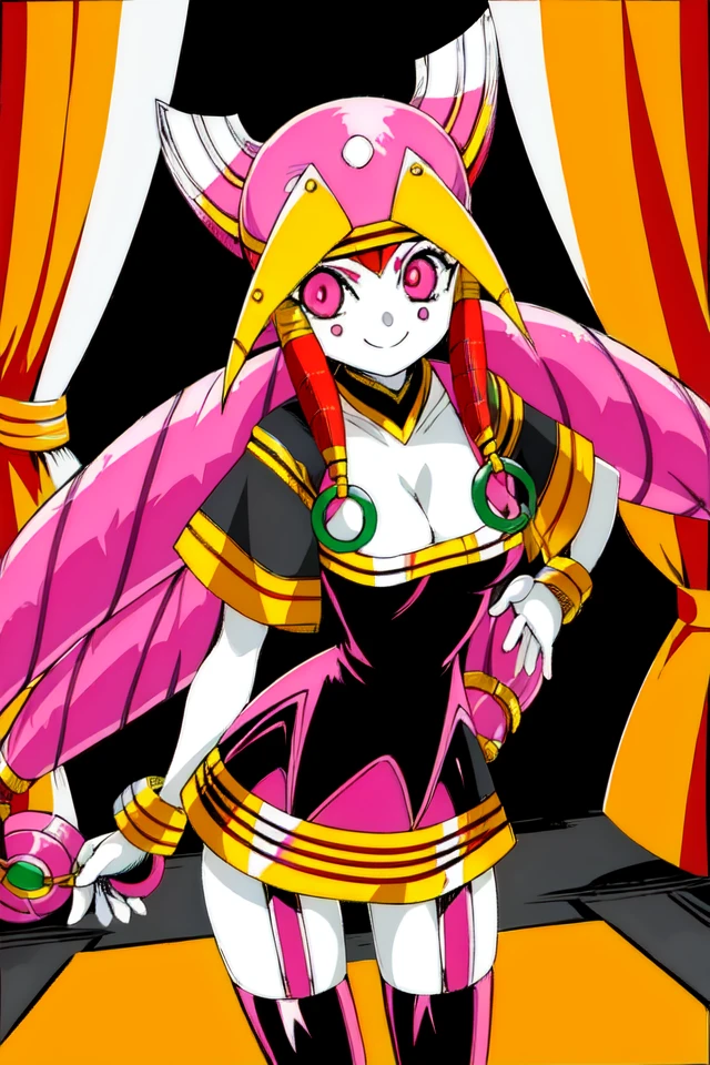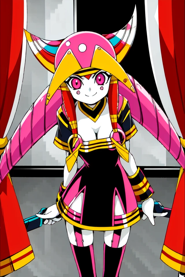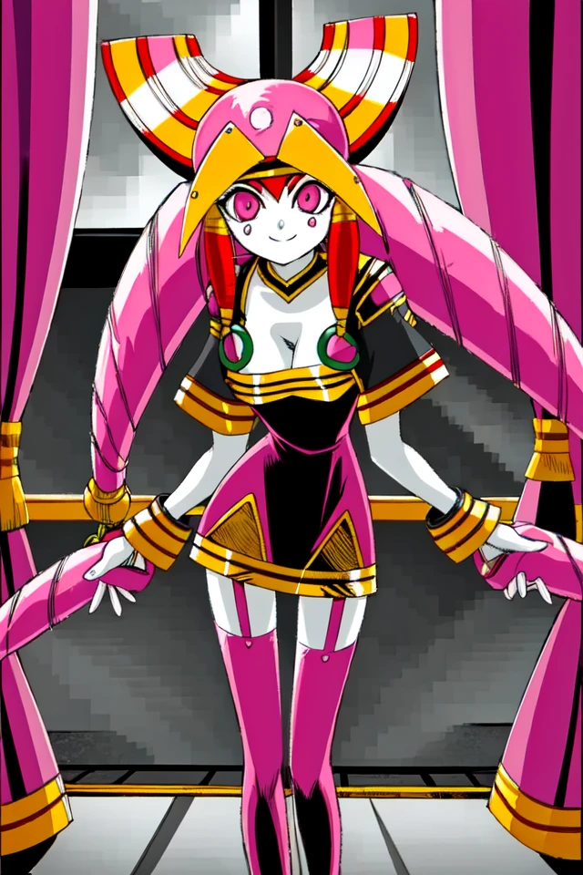 taratchet, robot girl, white skin, twin drills, pink eyes, cleavage, garter straps, thighhighs