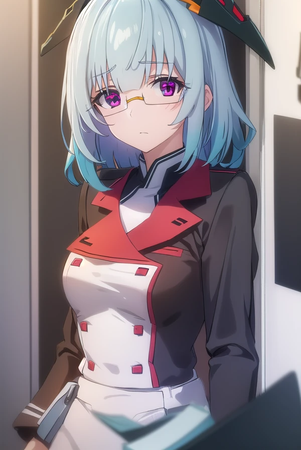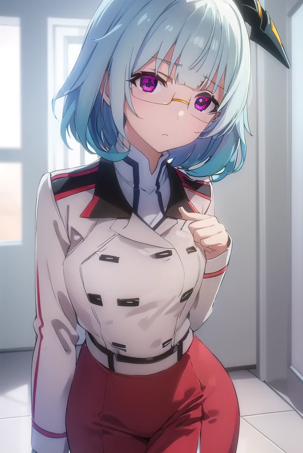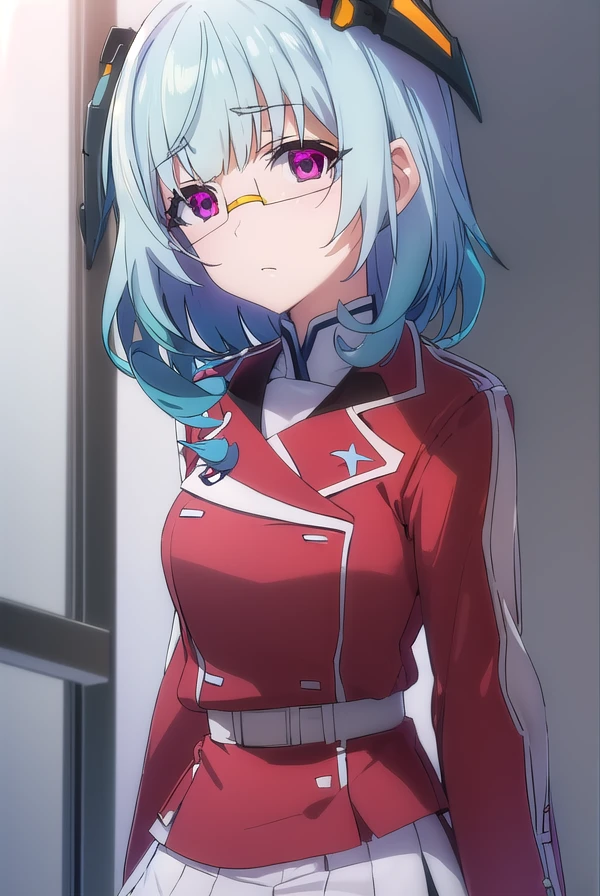 kanzashi sarashiki, (red eyes:1.3), blue hair, glasses, semi-rimless eyewear,