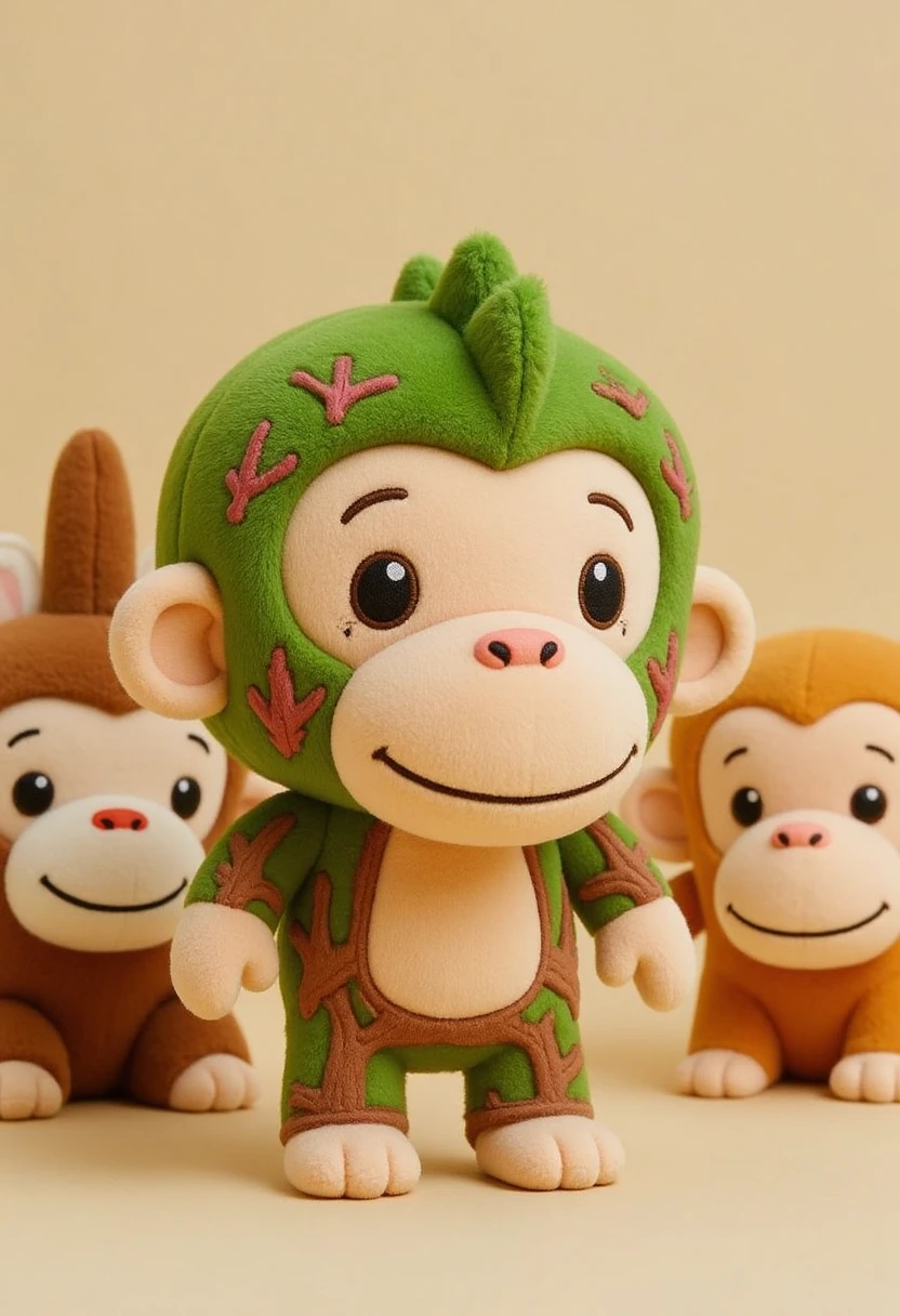 3D cartoon animal models, monkey with big nose, green head, tree pattern, friendly face, soft plush.