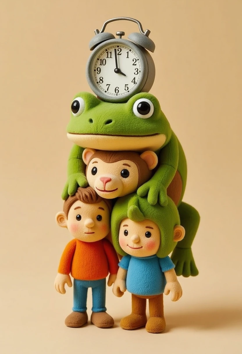 3D cartoon animal models, frog - monkey - human stack, clock on top, diverse characters, creative stacking, soft texture.