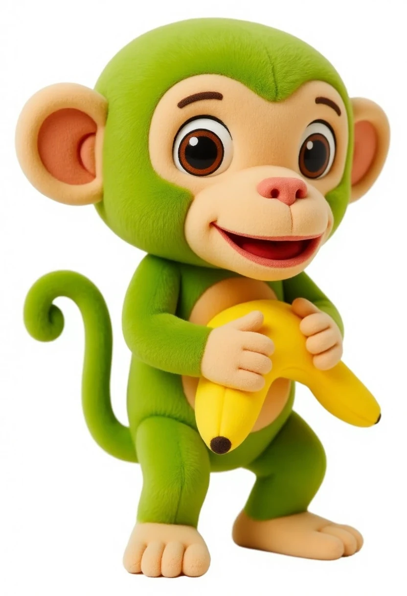 3D cartoon animal models, monkey holding banana, green fur, bright yellow banana, lively posture, soft material.