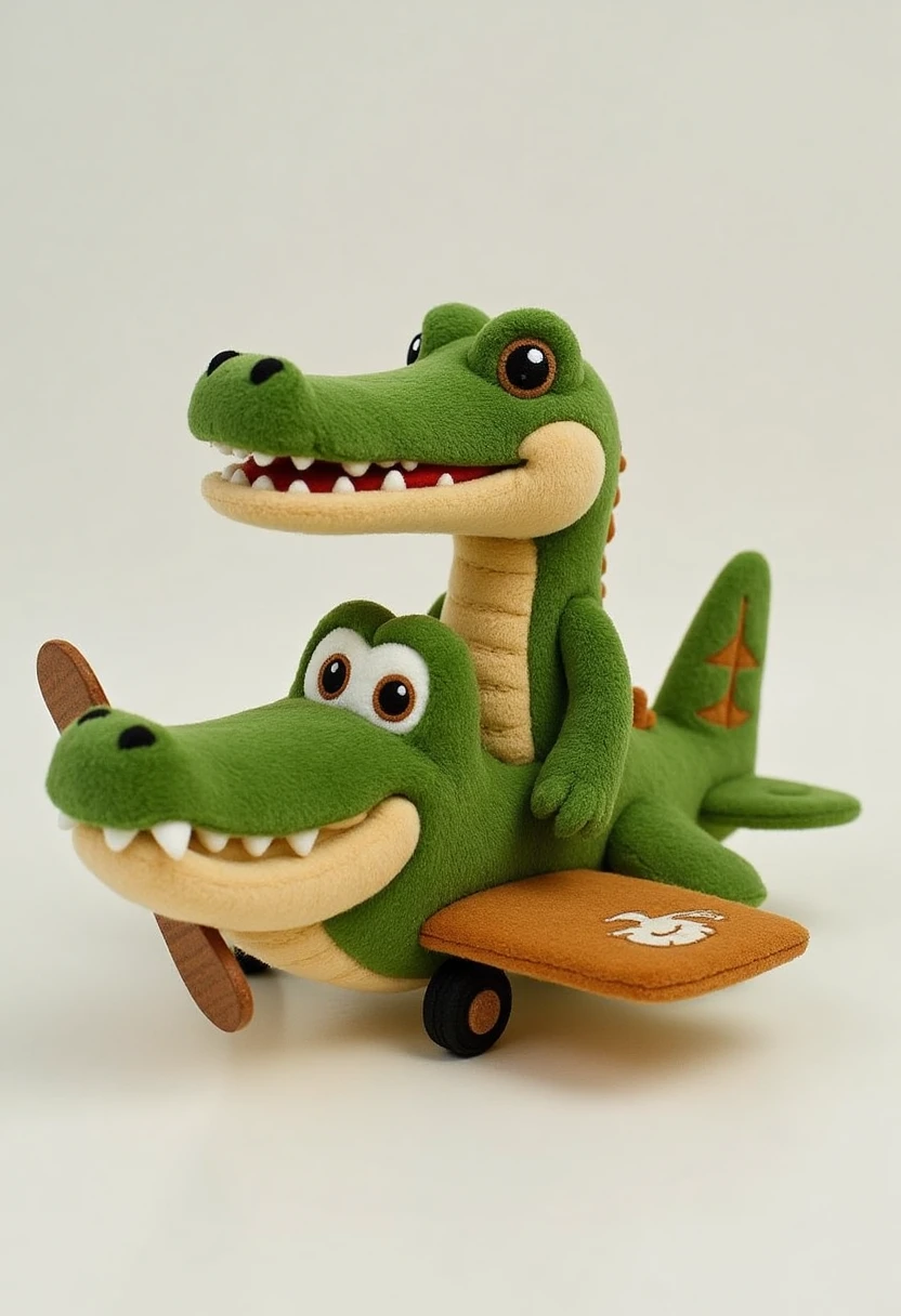 3D cartoon animal models, crocodile - plane hybrid, green and brown, aircraft details, cute crocodile face, plush material.