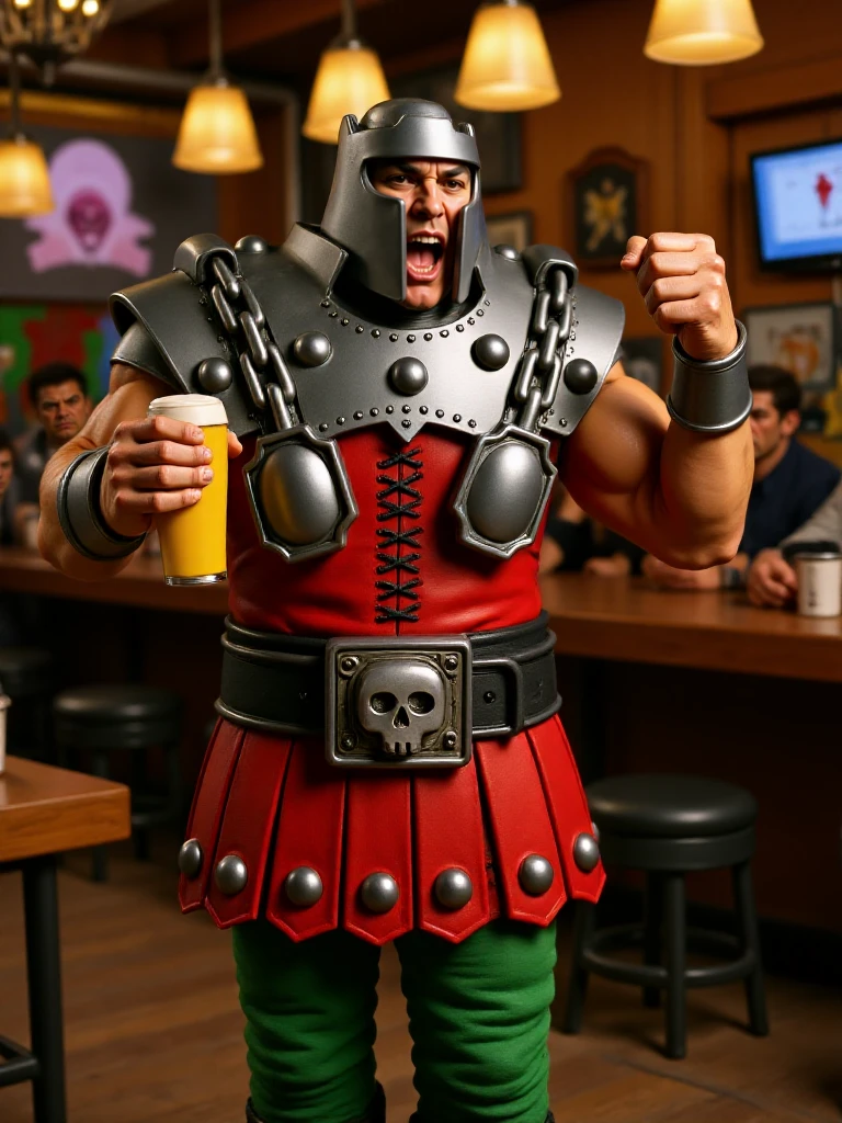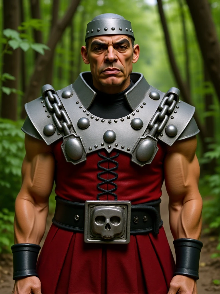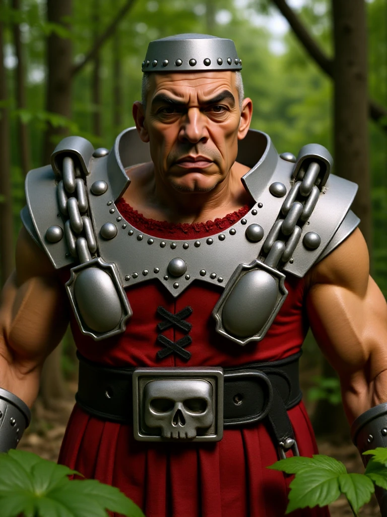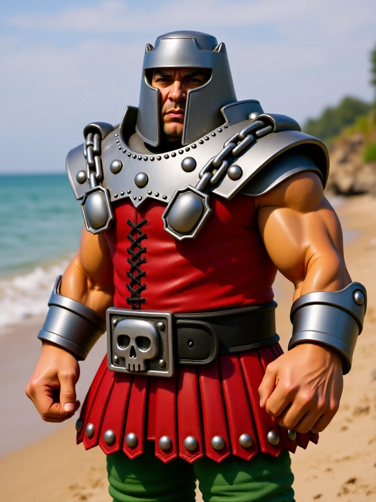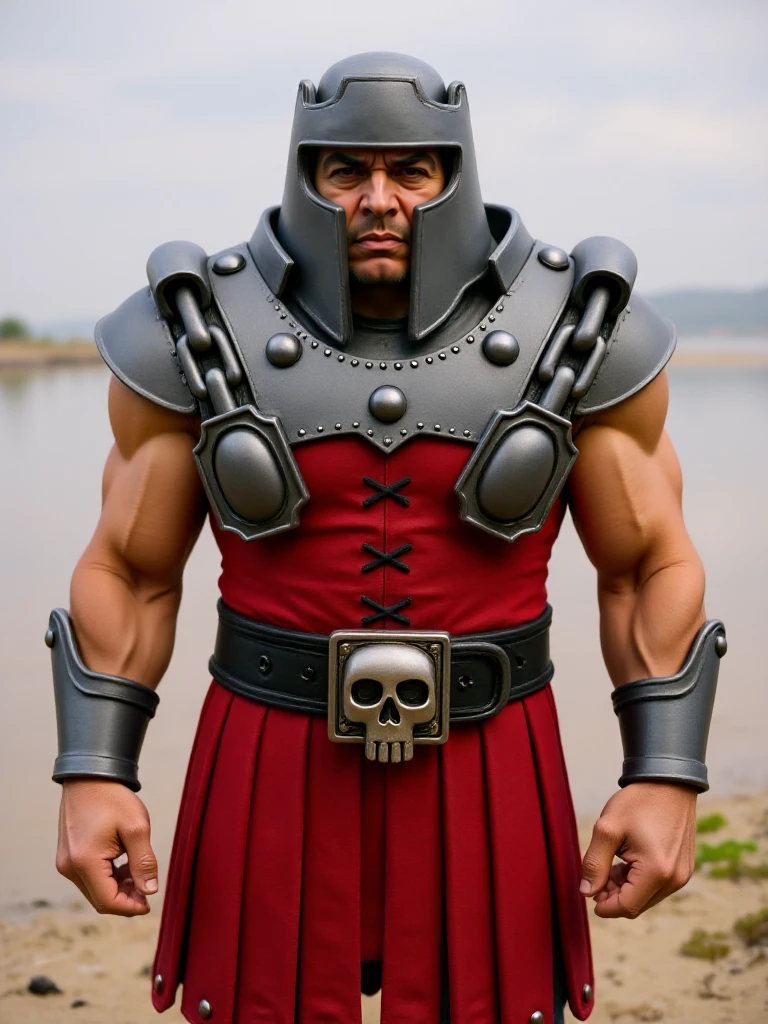 man with helmet and armor wearing a red laced top and red skirt and skull belt buckle
