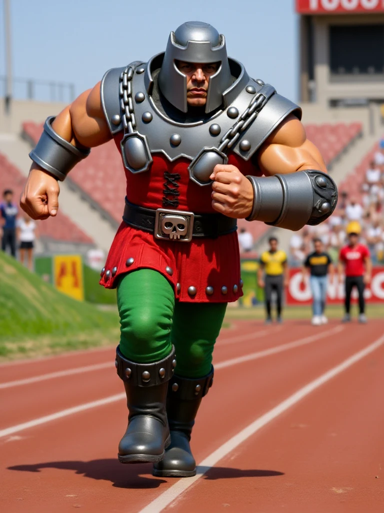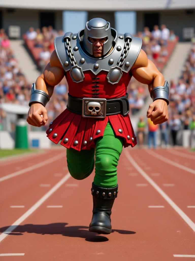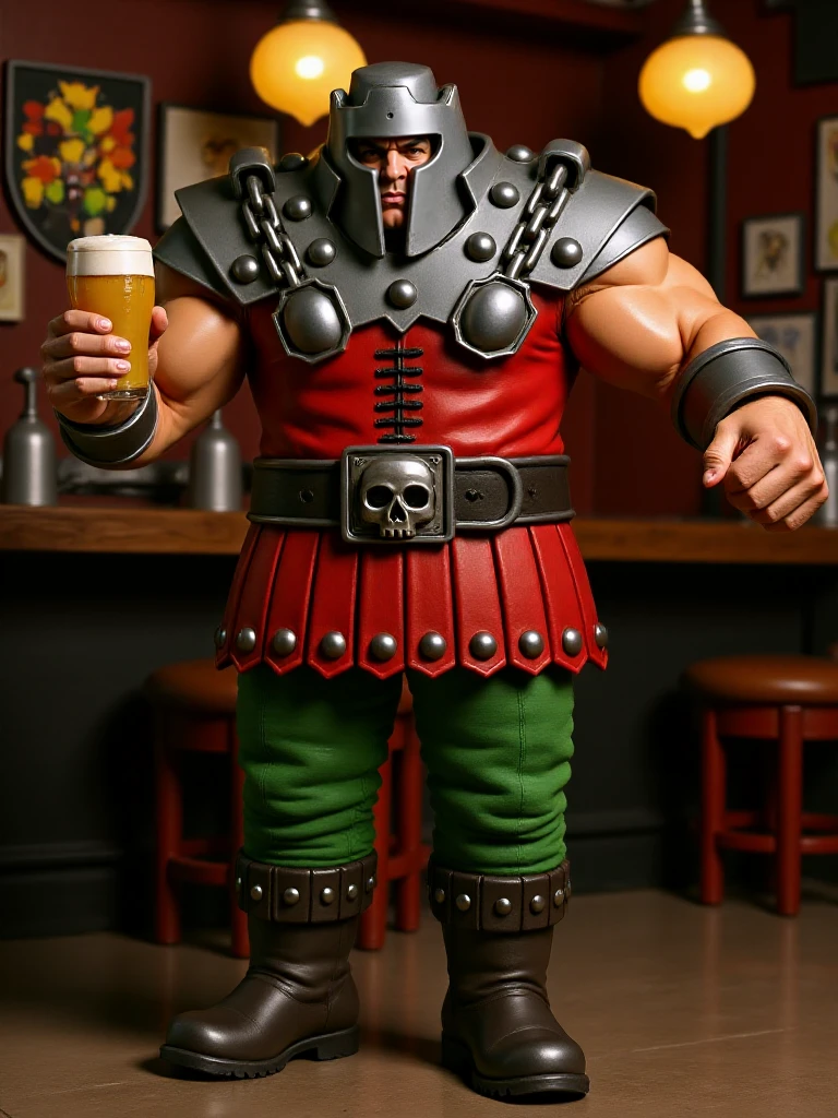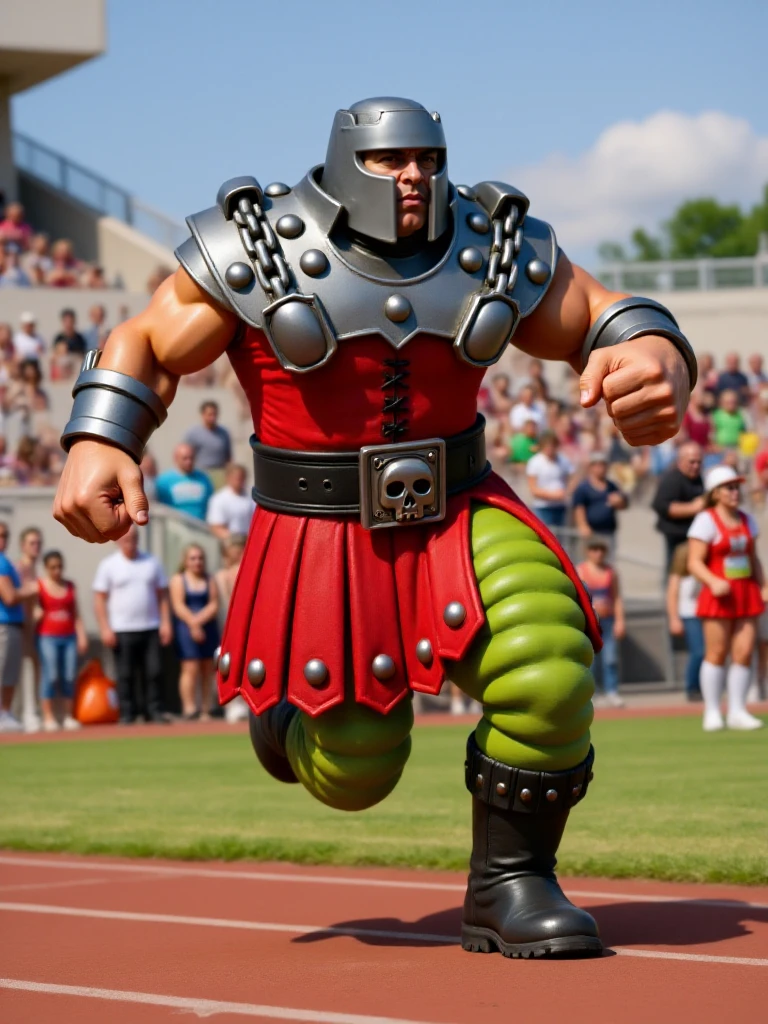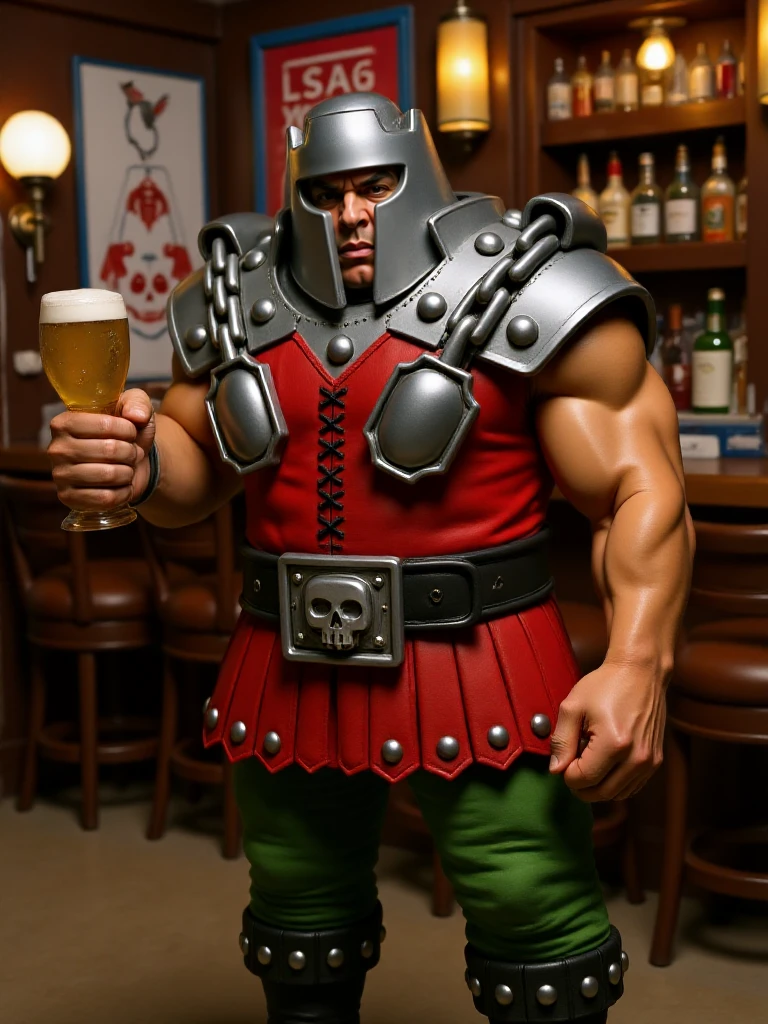 man with helmet and armor wearing a red laced top and red skirt and skull belt buckle