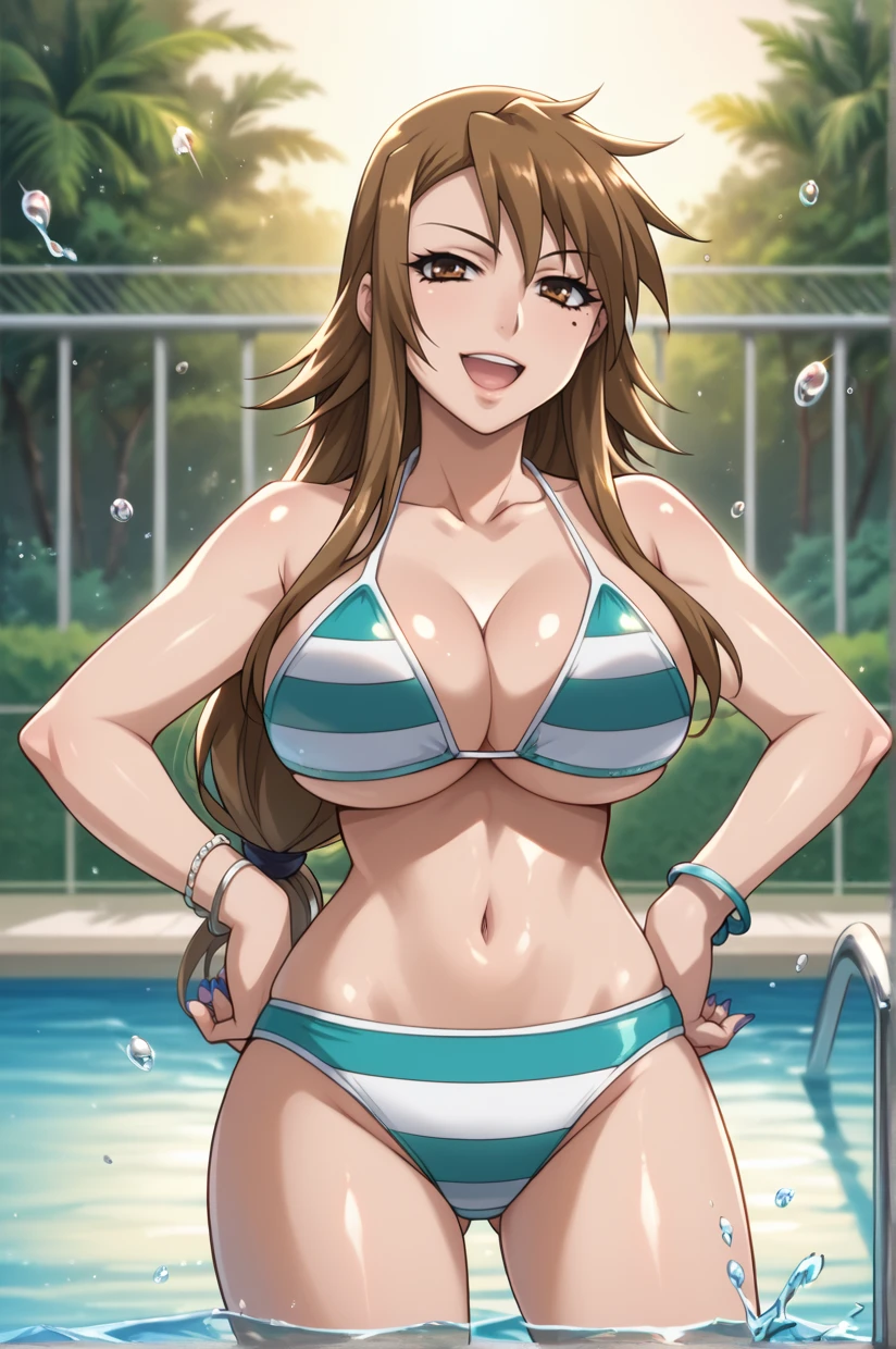 KSBikini, swimsuit, striped bikini, cleavage, navel, bracelet, jewelry, underboob, low-tied long hair