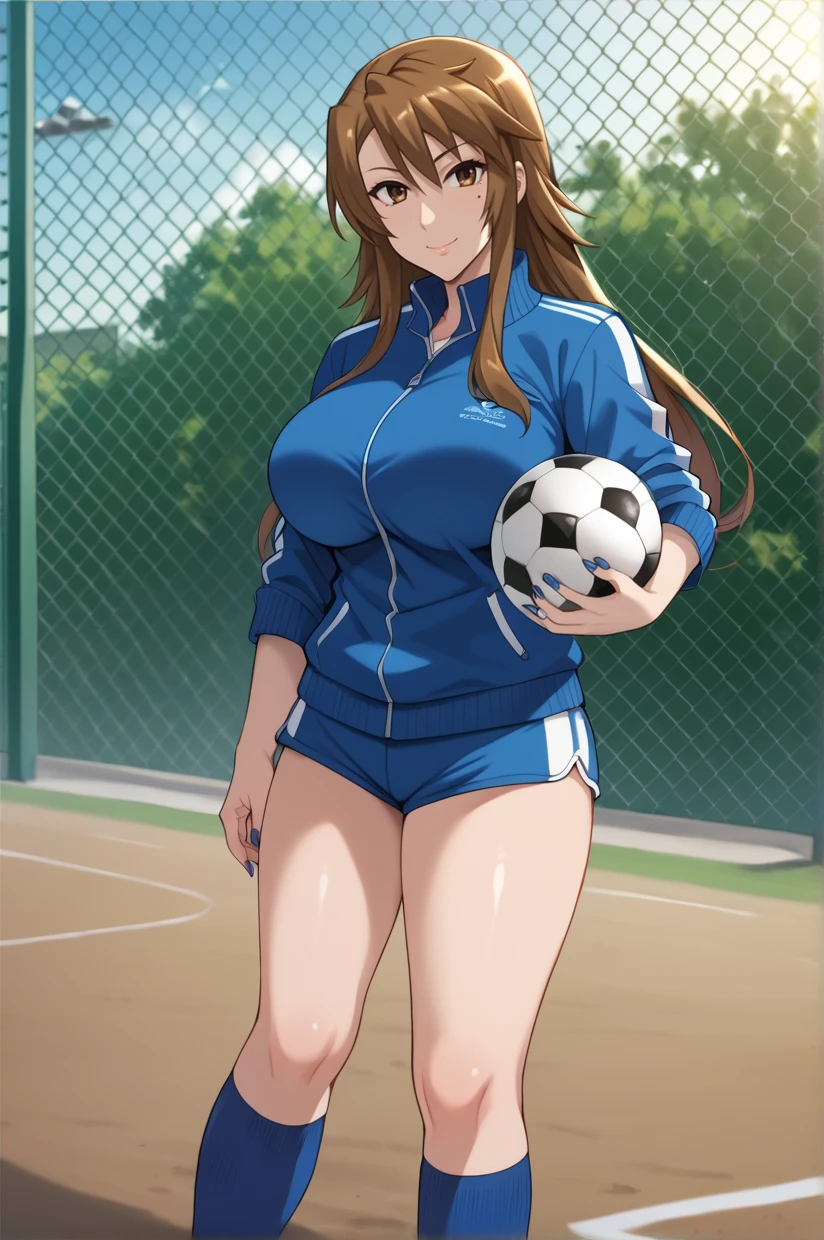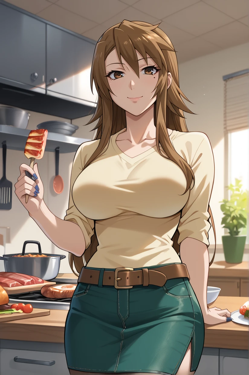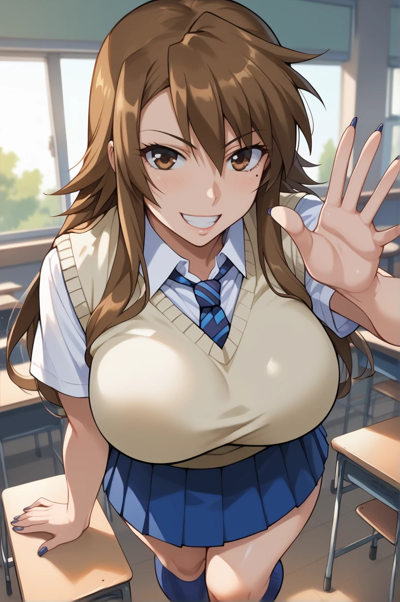 long hair, brown hair, brown eyes, large breasts, nail polish, blue nails, mole under eyeAttire