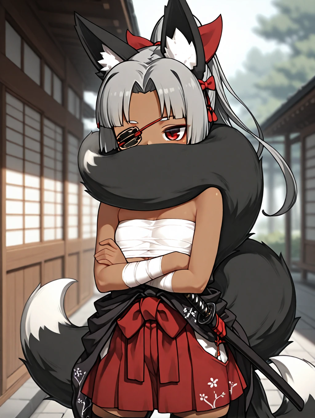 Izuna, grey hair, high-ponytail, red eyes, black fox ears, black fox tail, 4 tails, dark_skin, eyepatch, bandages, sarashi, red skirt, hair bow, red bow, tail over mouth, covered mouth, tail around head, black thighhighs,