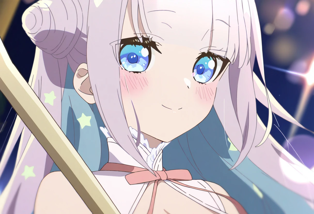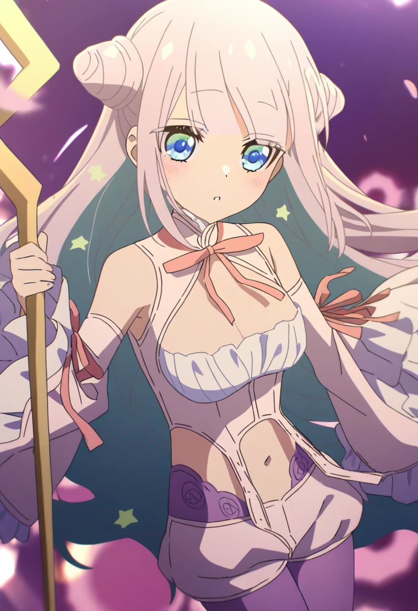 1girl,mimori_byakuya,blue eyes,,hair bun,long hair,breasts,navel,detached sleeves,midriff,double bun,shorts,wide sleeves,cleavage,staff,ribbon,blunt bangs,sidelocks,frilled sleeves,pink hair,crop top,shirt,frills,pink ribbon,pantyhose,bare shoulders,multicolored hair,parted lips,medium breasts,long sleeves,如需番剧画风。添加bangumi_style。不会请抄例图tag