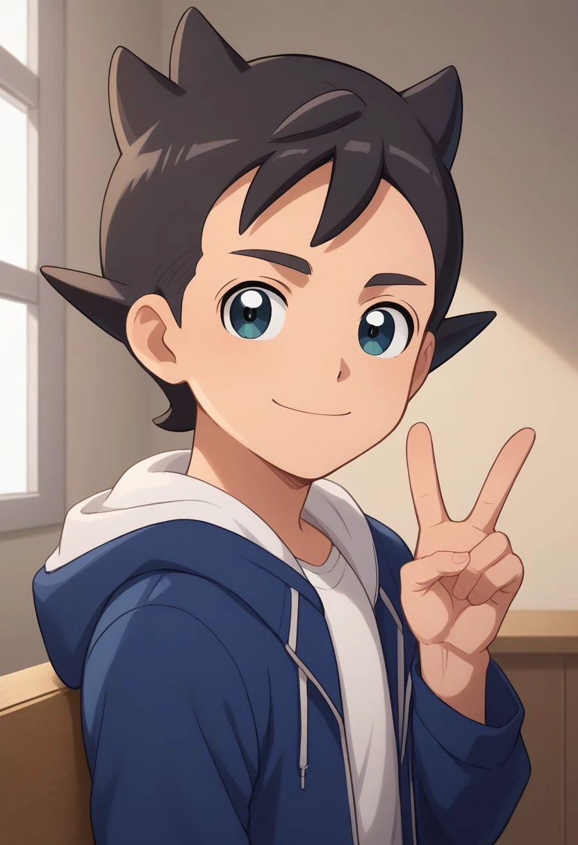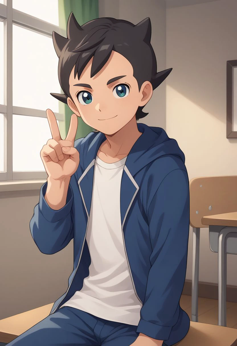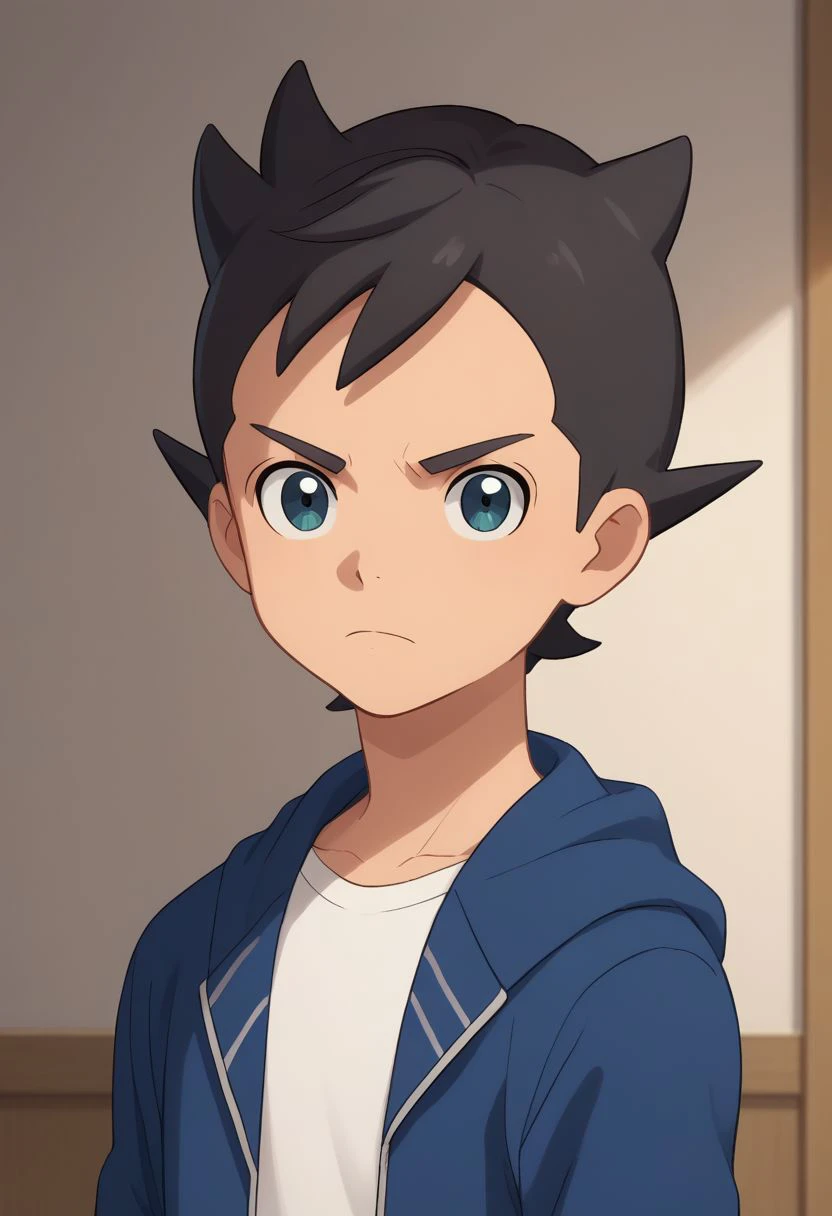 InamoriAsuto, 1boy, male focus, solo, green eyes, black hair, spiked hair, shirt, white shirt, hoodie, blue hoodie, hood, short sleeves, open hoodie, shorts, black sorts, shoes, white footwear,