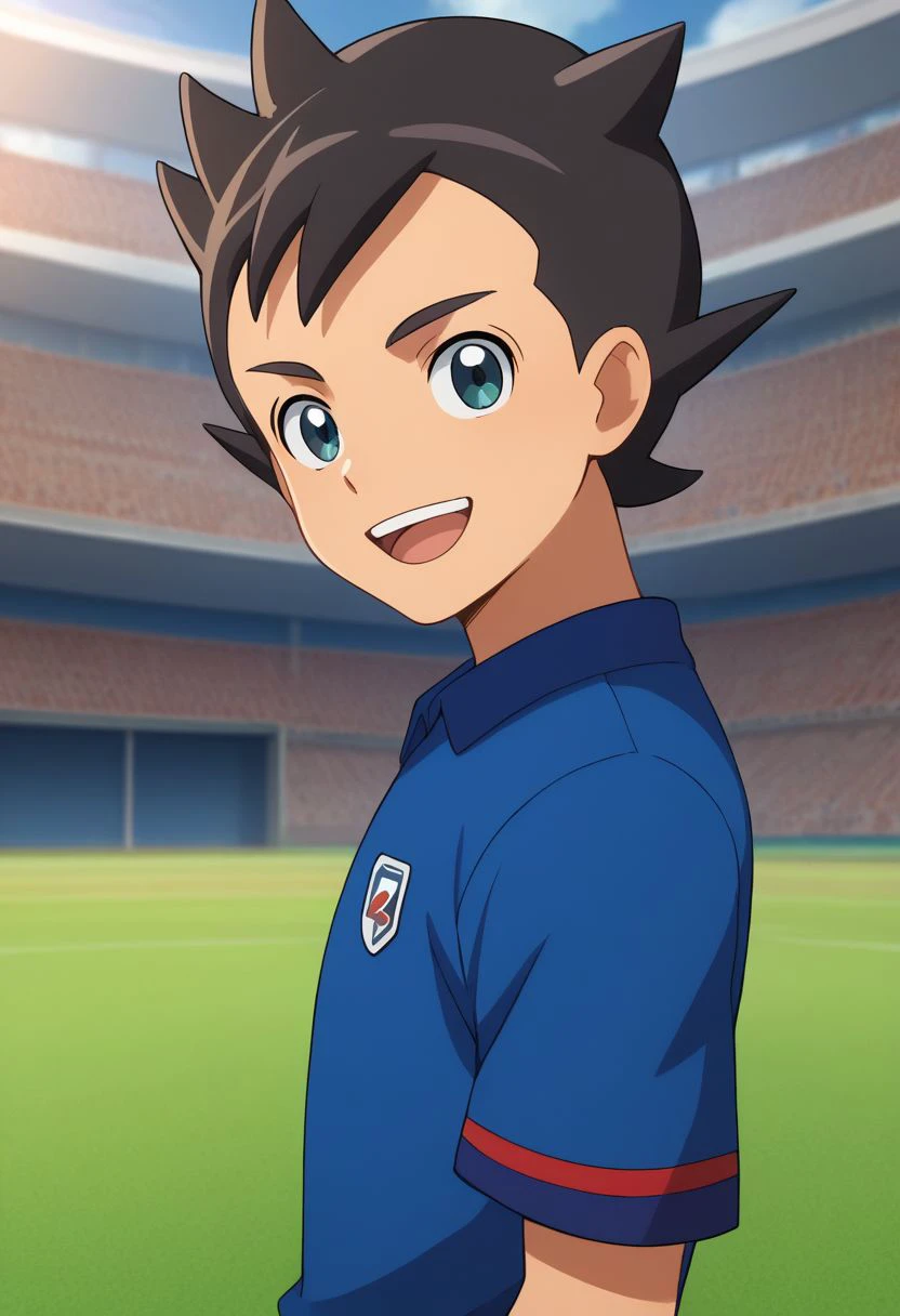 InamoriAsuto, 1boy, male focus, solo, green eyes, black hair, spiked hair, orion soccer uniform, shirt, blue shirt, raglan sleeves, short sleeves, shorts, blue shorts, socks, blue socks, shoes, sneakers,