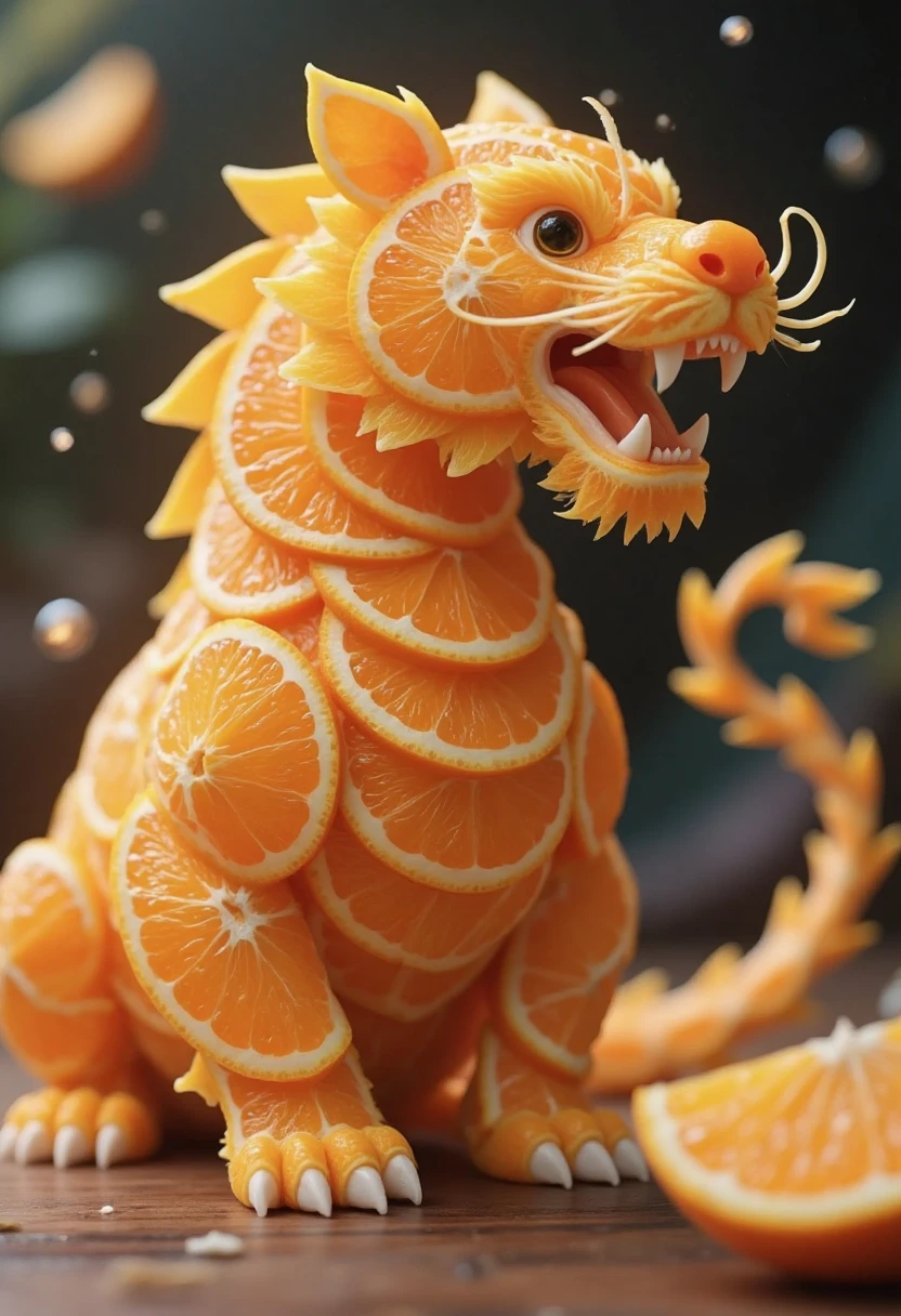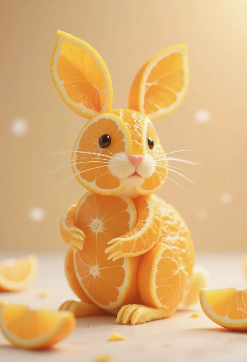 Composed of orange slices, form a graceful rabbit. The rabbit sits quietly, with a few orange slices as props, gentle background, and a warm atmosphere.