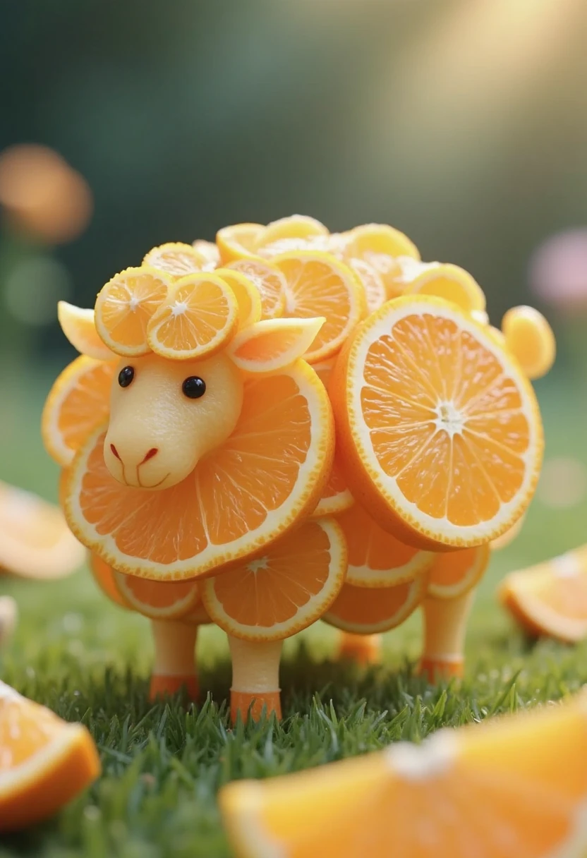 Composed of orange slices, construct a peaceful sheep. The sheep grazes, orange slices as grass, natural setting, and a serene atmosphere.