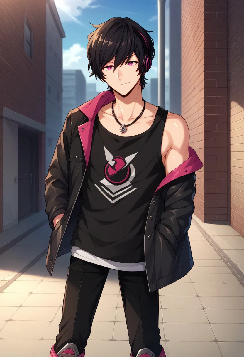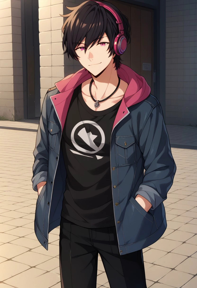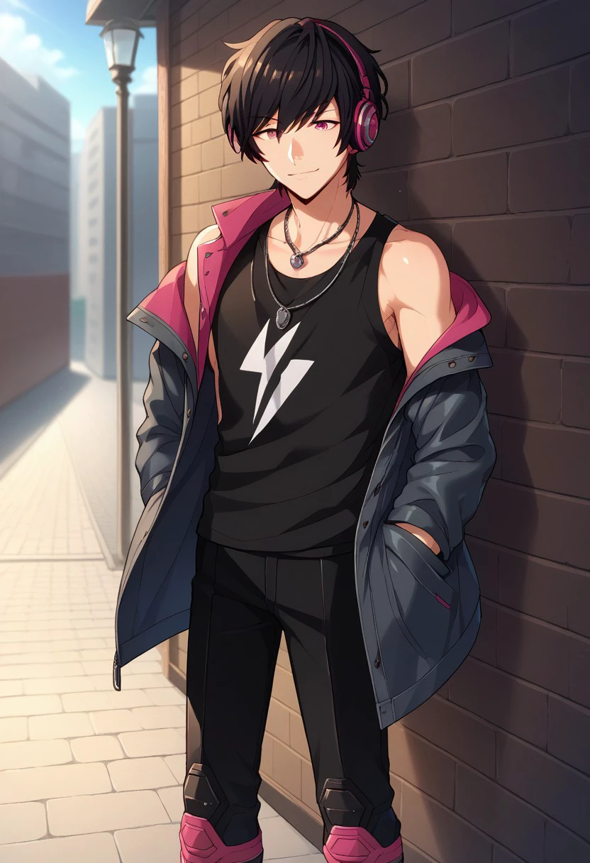 Hero - faithbeams, 1boy, male focus, headphones, black hair, shirt, jacket, pink eyes, necklace, jewelry, black shirt, black footwear, pants, hood, black pants, boots, knee boots