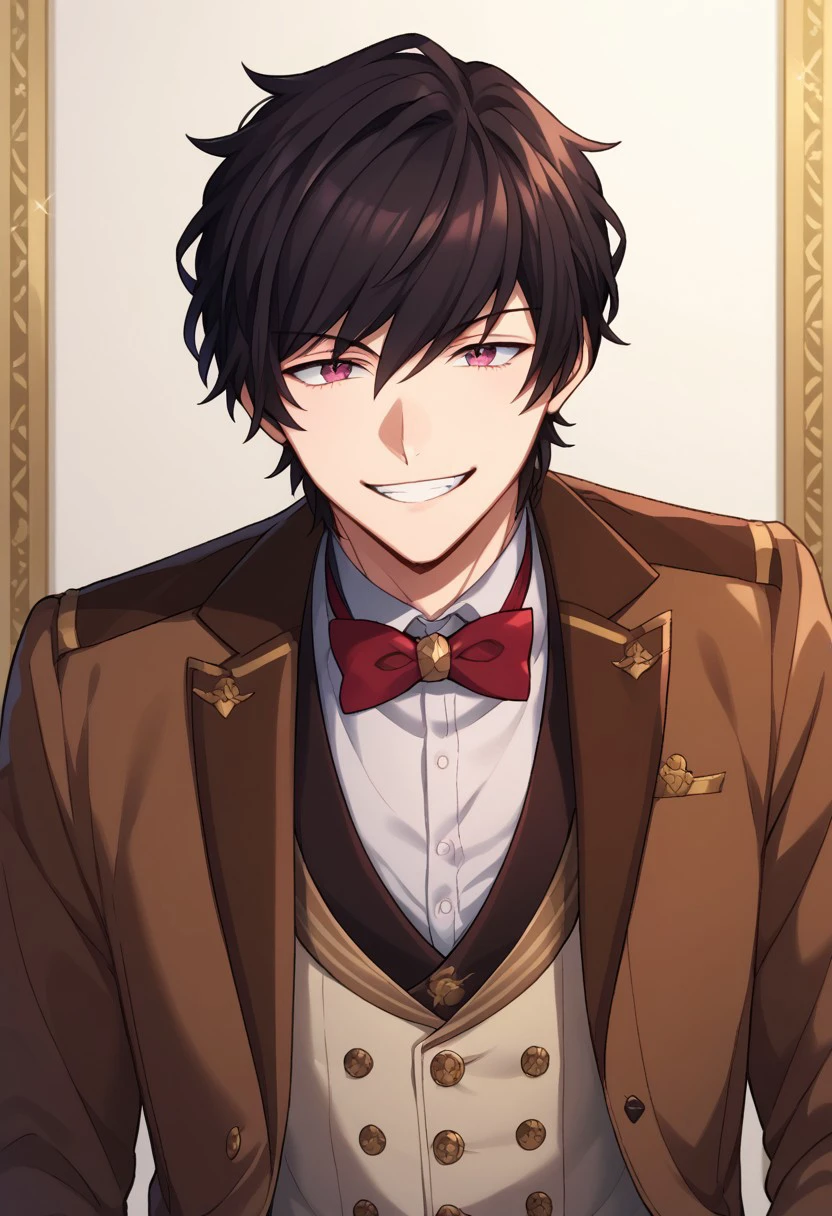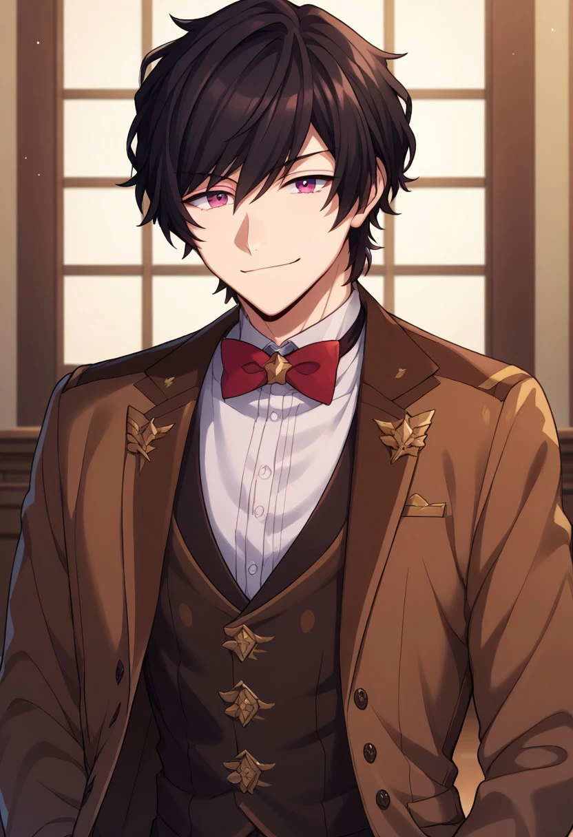 Formal - faithbeams, 1boy, male focus, bowtie, black hair, bow, red bow, brown jacket, hand red bowtie, vest, jacket, pink eyes, long sleeves, brown vest, purple eyes, formal,