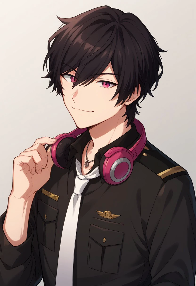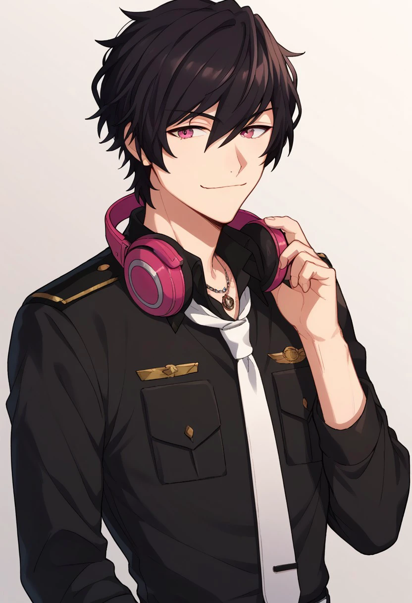 Uniform - faithbeams, 1boy, male focus, necktie, headphones, black hair, headphones around neck, white necktie, shirt, black shirt, pink eyes, necklace, hair between eyes, jewelry, bangs,