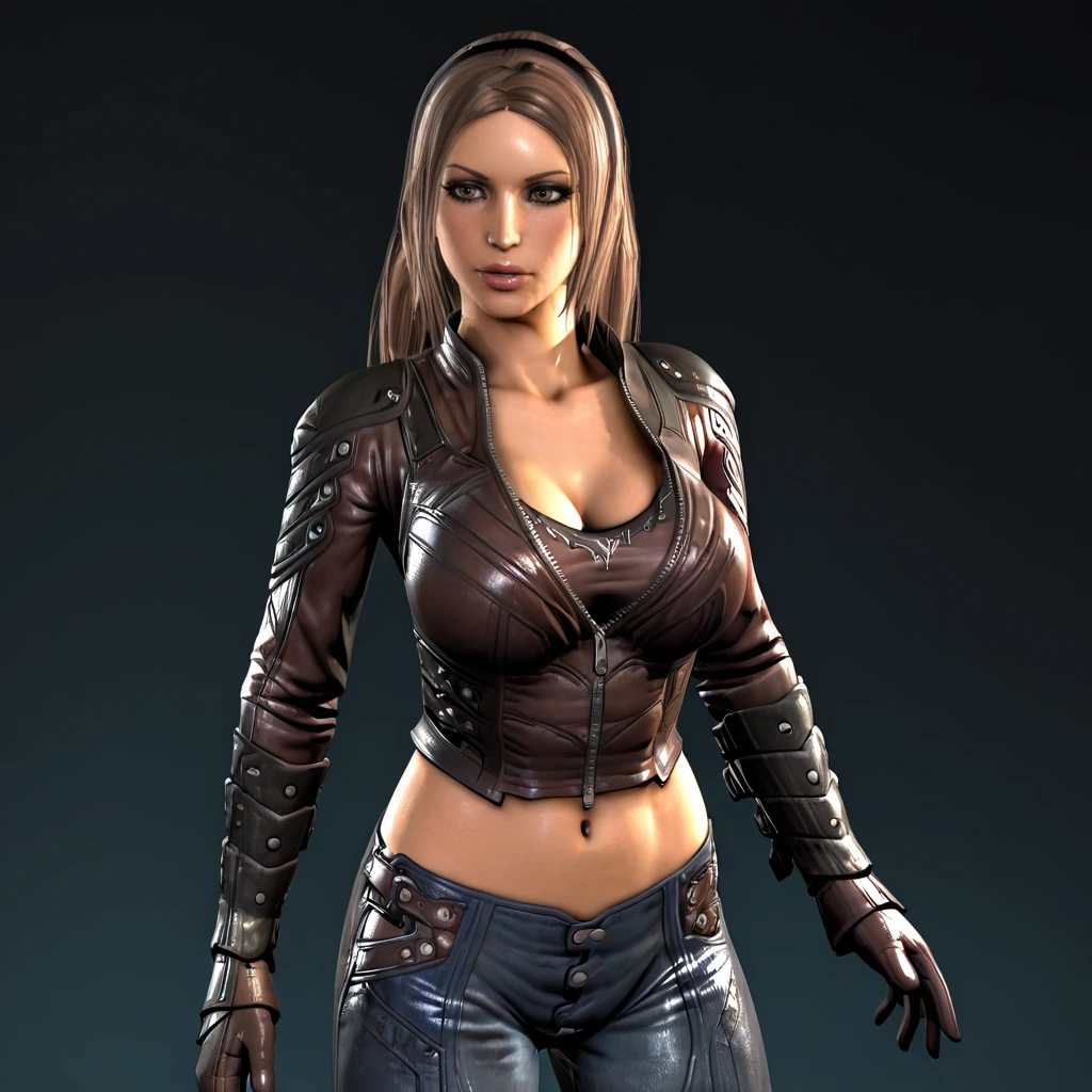Trigger : TaliaAlGhulArkhamCity, 1girl, midriff, large breasts, leather, makeup, long hair, brown hair, hairband, brown eyes, gloves, denim, cleavage, navel, jeans, pants, unzipped, lips, 3d, cowboy shot