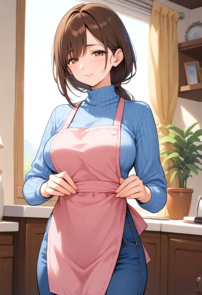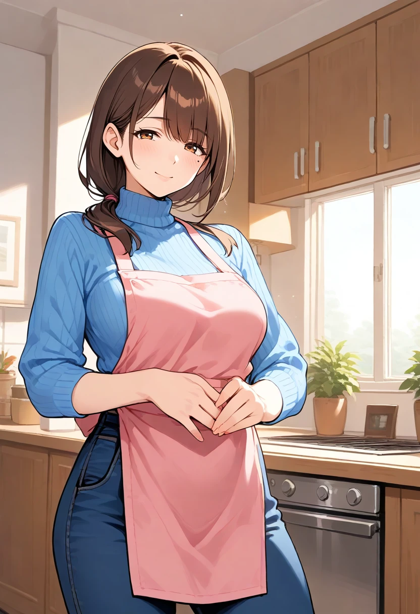 Example of clothing:sweater, ribbed sweater, blue sweater, turtleneck, large breasts, apron, pink apron, blue pants,denim,