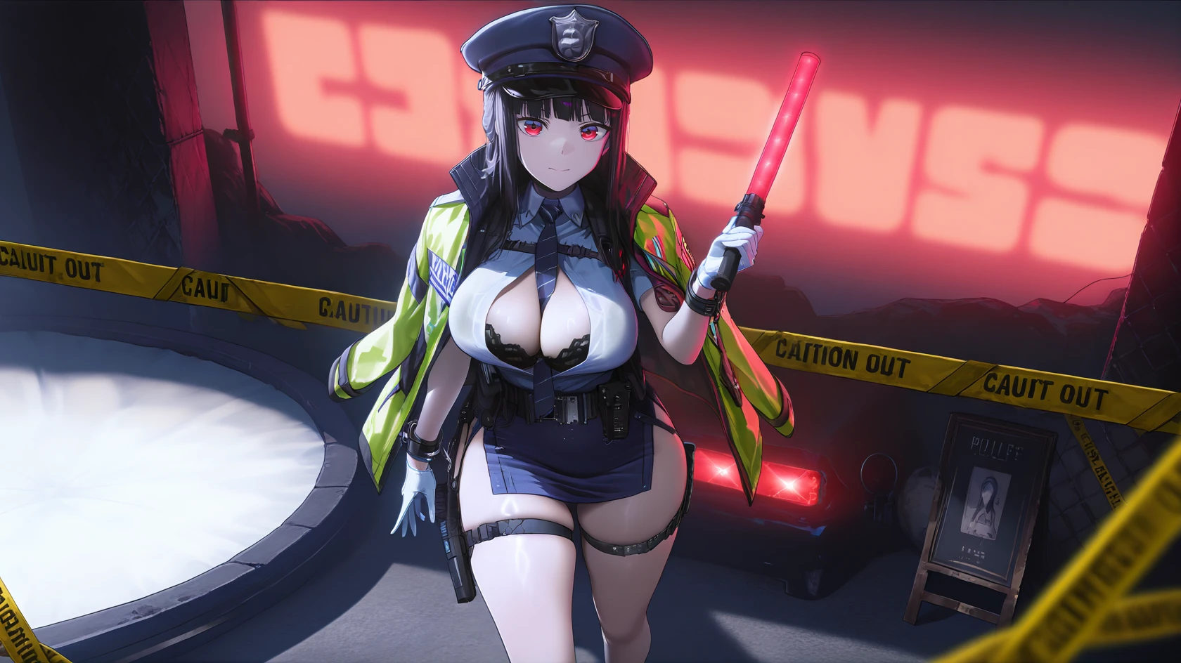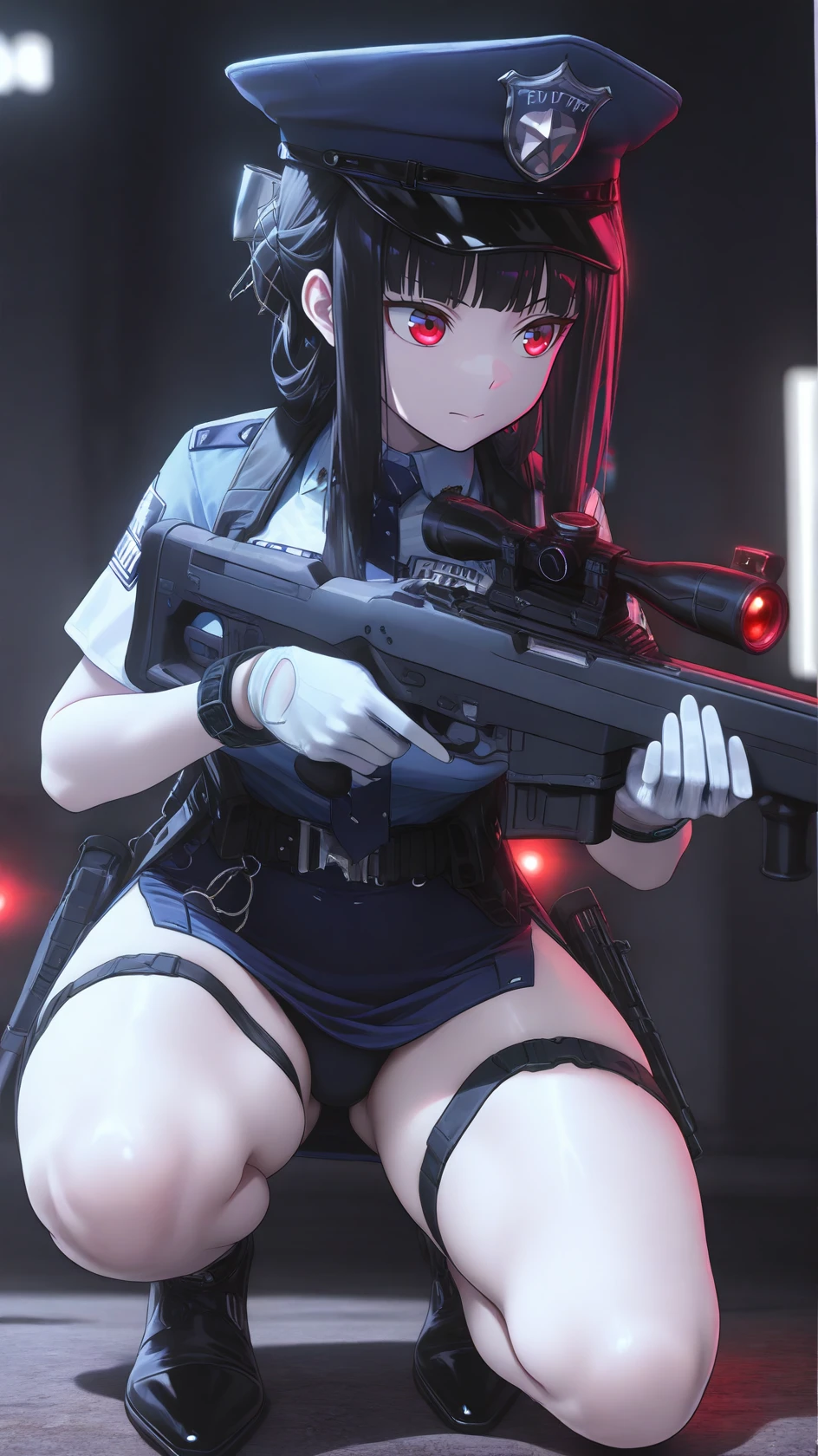 gloves, thighs,, white gloves, black footwear, bra, , thigh strap, black bra, panties, police hat, miniskirt, blue skirt, white shirt, police uniform,