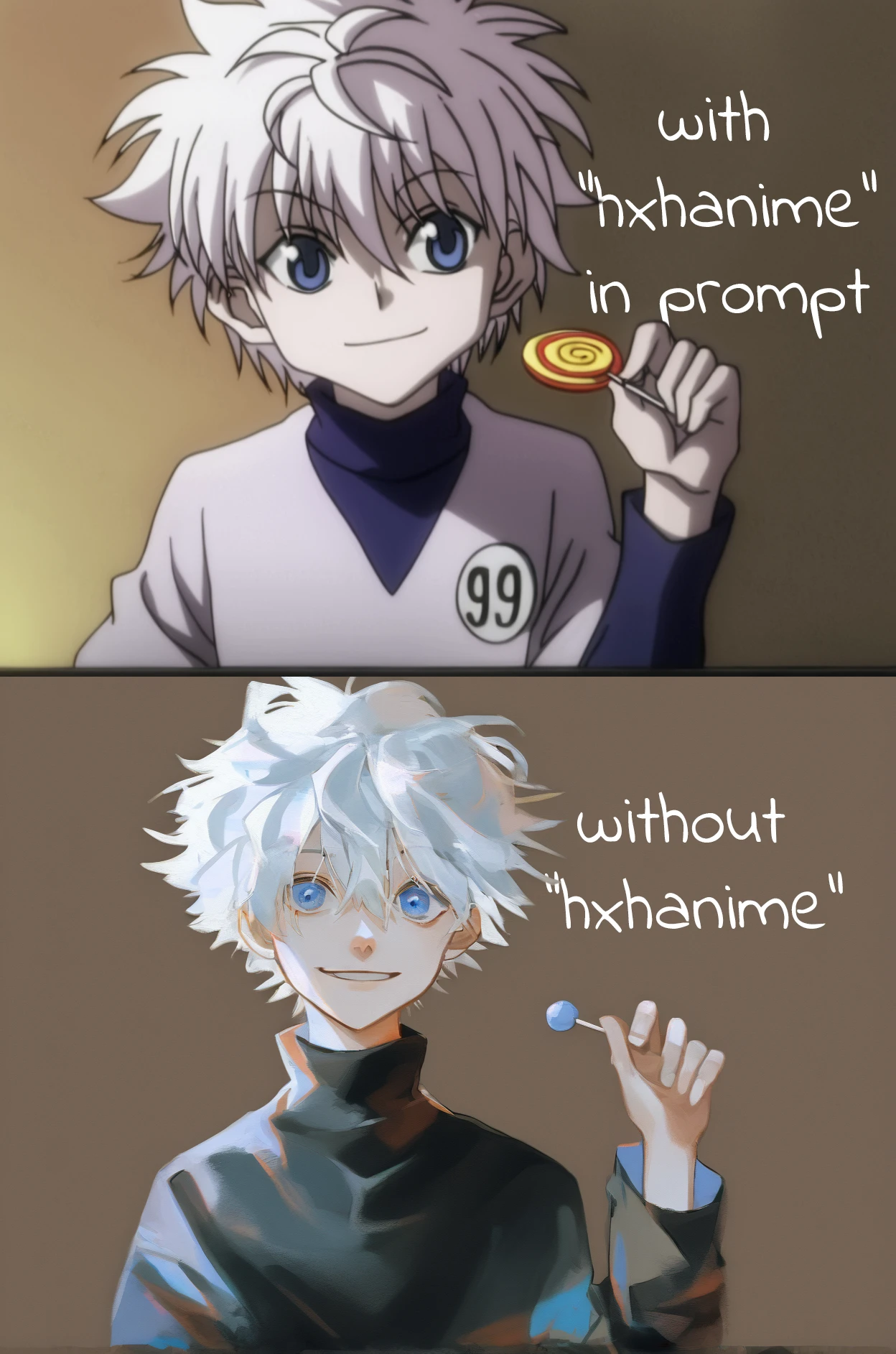 You can use "hxhanime" in the prompt to get killua from the anime. Also I've captioned the images following the prompting of the PonyDiffusion V6XL Model. So using something like score_8_up may improve quality.