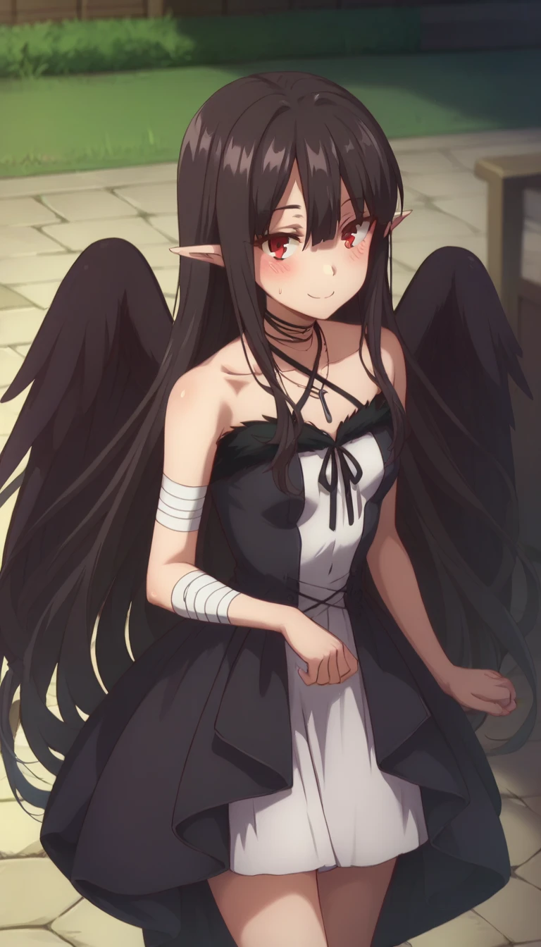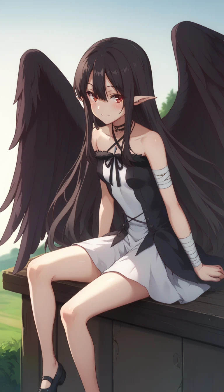 jewelry,choker,necklace,bare shoulders,collarbone,halterneck,black coat,white dress,sleeveless dress,halter dress,strapless dress,criss-cross halter,black ribbon,fur trim,small breasts,bandaged arm,black wings,feathered wings,black feathers,bare legs,no socks,mary janes,black footwear
