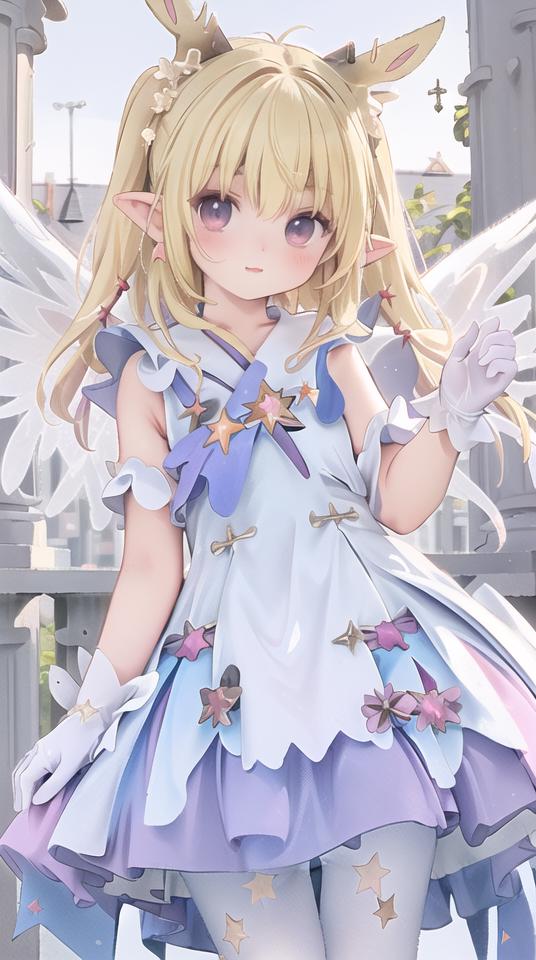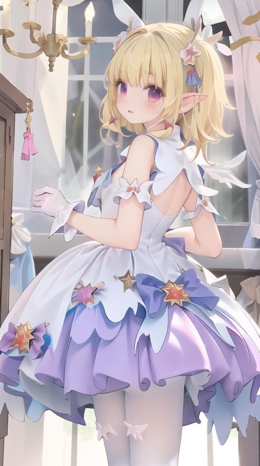 1girl,yao shiyuan,blonde hair,dress,gloves,white pantyhose,pointy ears,star \(symbol\),