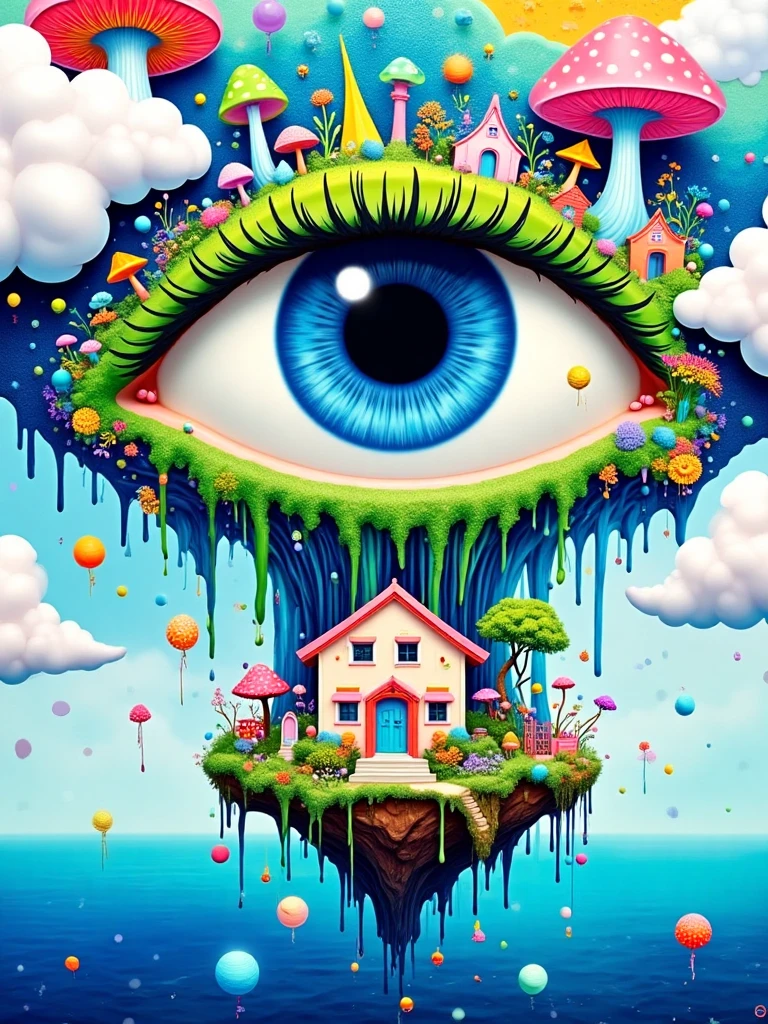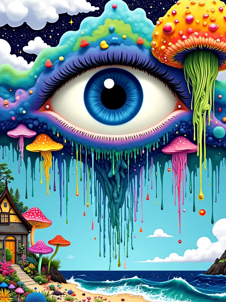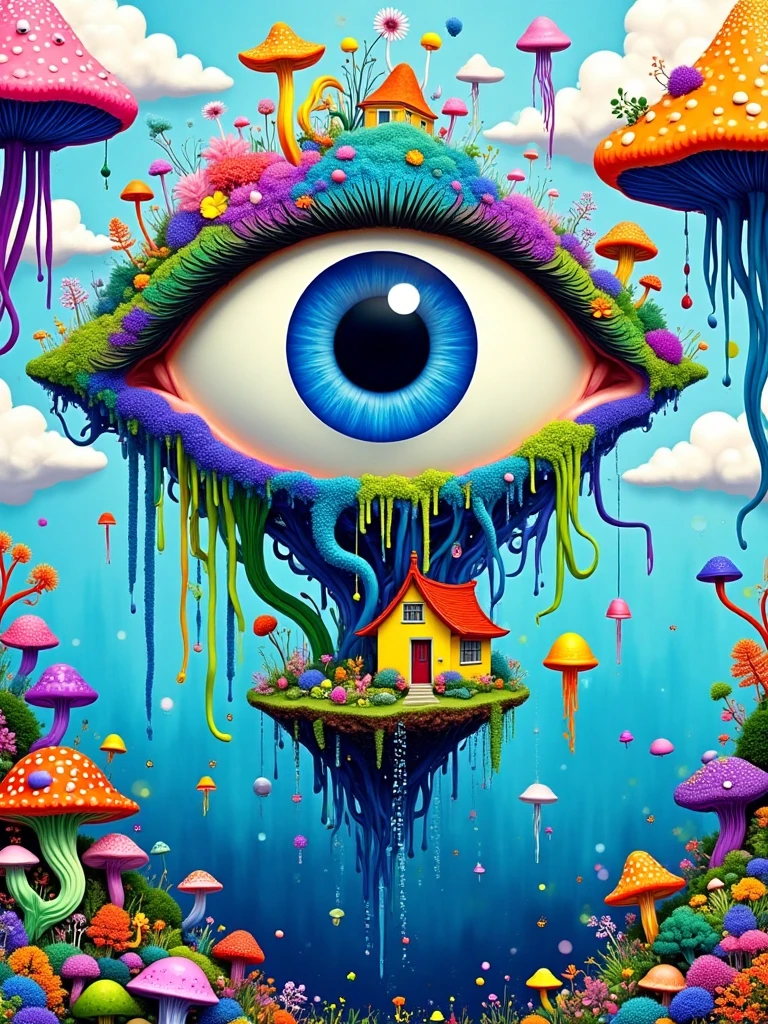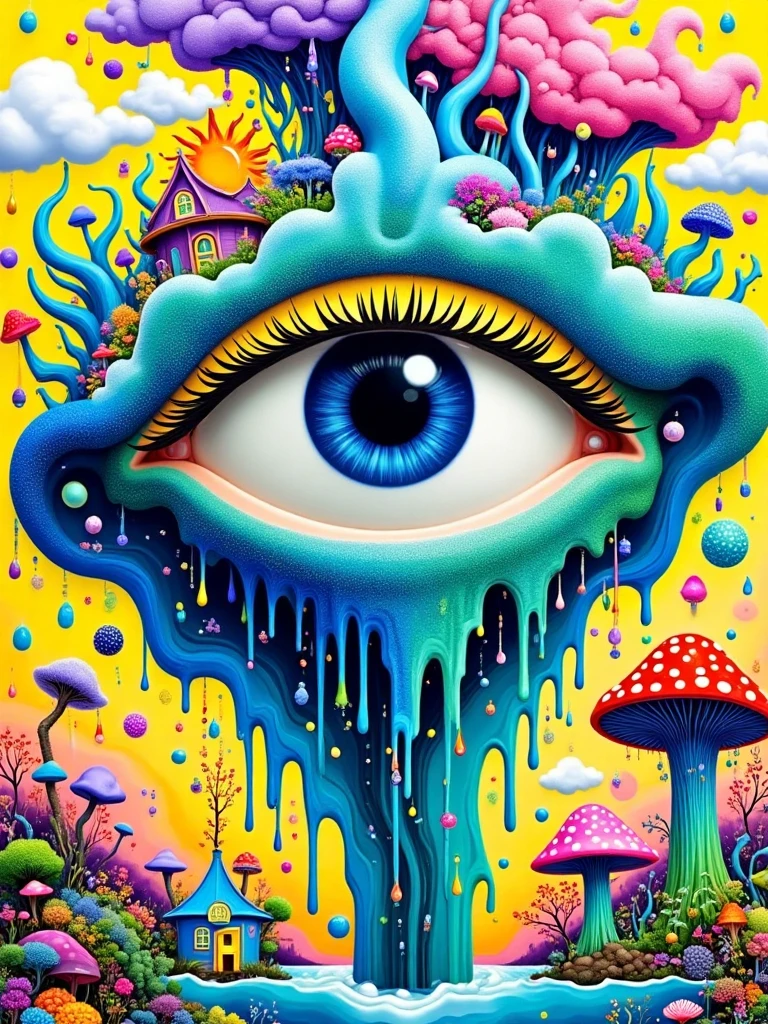 Each has a prominent eye and fantasy landscapes, with dripping paint effects, glowing mushrooms, ocean waves, and dreamy skies, creating a surreal vibe.