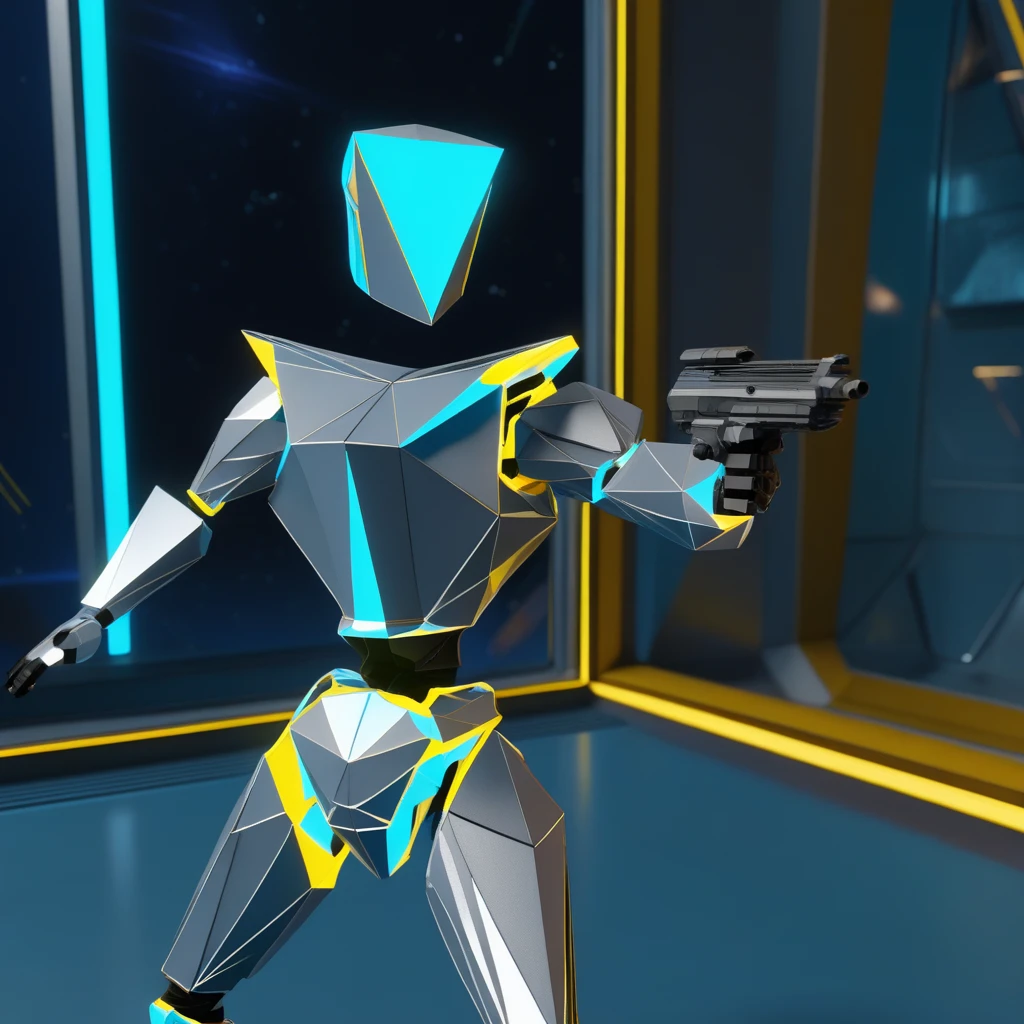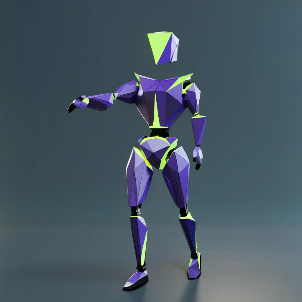 This model depicts a Vatoko robot with a triangular head and a body made up of triangles. Its joints are connected by small bridges, making its shape recognizable and cybernetic, distinguishing it from a humanoid. In the original, its head is not connected to the body and is suspended above the shoulders.