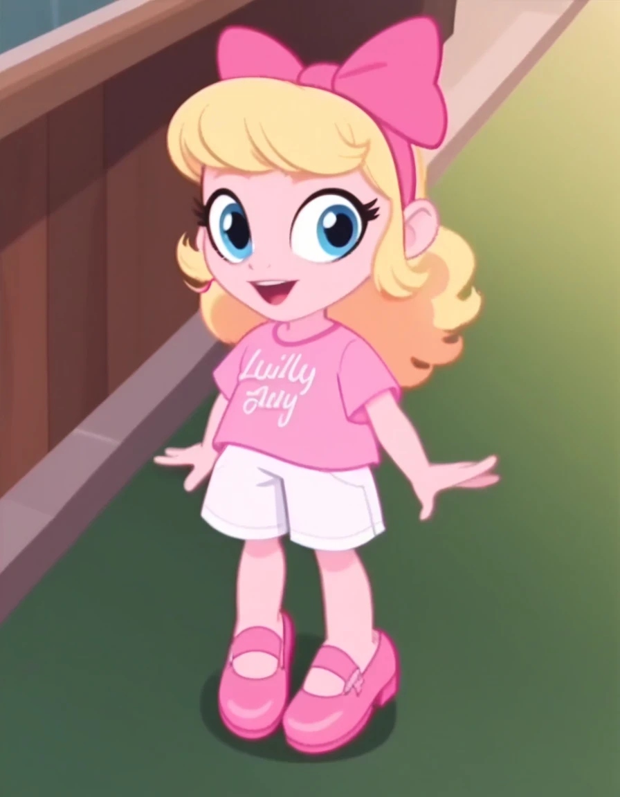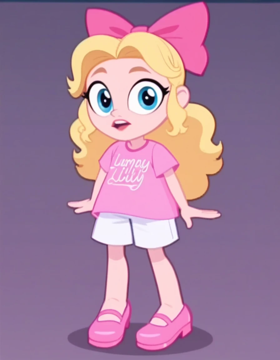 Lilly_ThirtyacreSML, blue eyes, blonde hair, 1girl, dress, bow, hair bow, pink bow, pink shirt, pink footwear, white shorts, english text on shirt