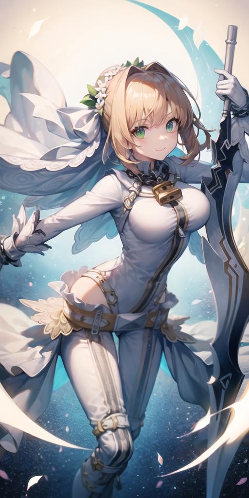 Recommended prompts: ahoge, blonde hair, head wreath, bridal veil, lock, green eyes, chain, elbow gloves, zipper, belt, hair intakes, bangs, hair between eyes, loose belt, center opening, cleavage, white bodysuit, puffy detached sleeves, leotard, zipper pull tab, single hair bun, white footwear, hair ornament, sidelocks, petals, white leotard, collarbone, strapless