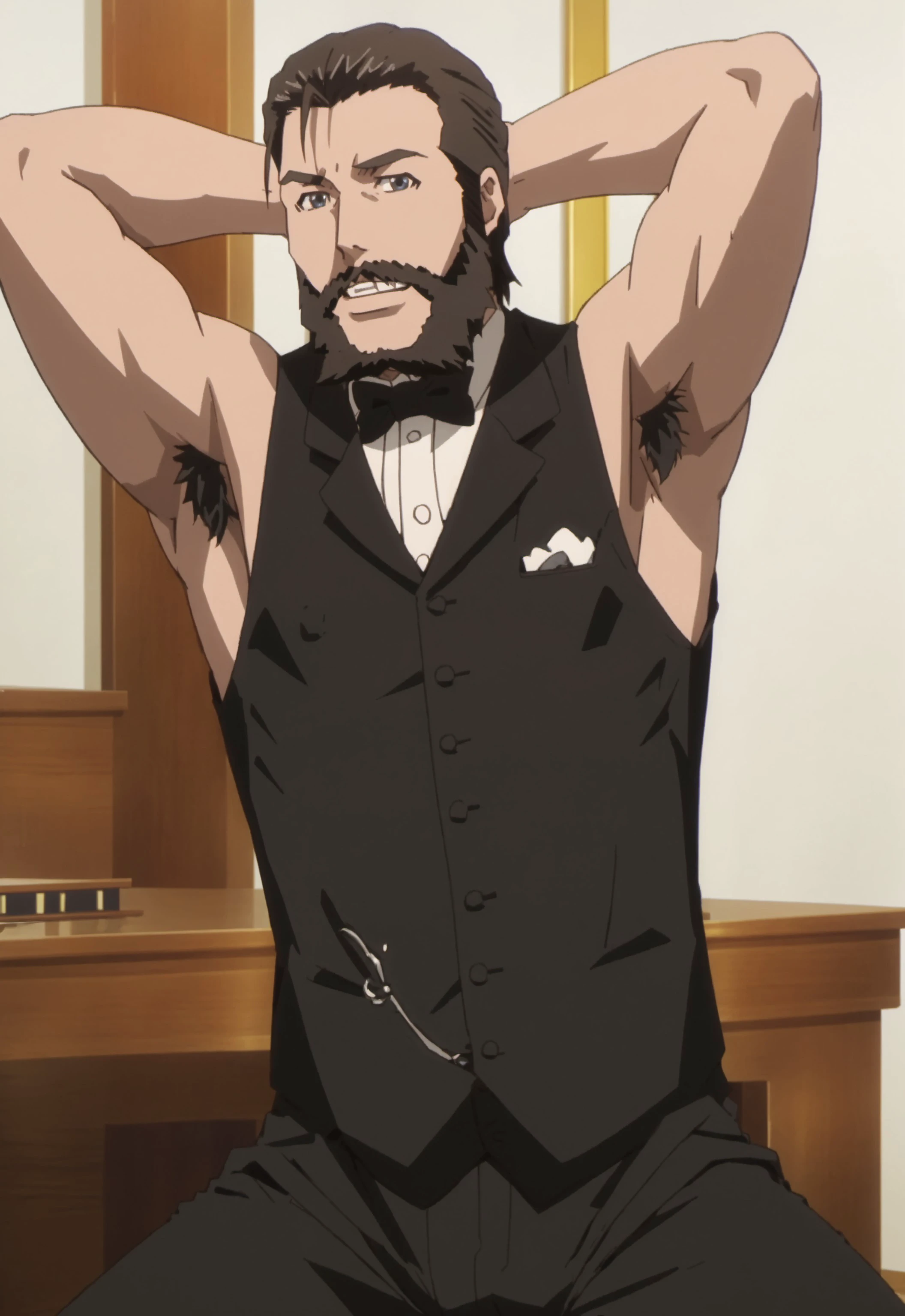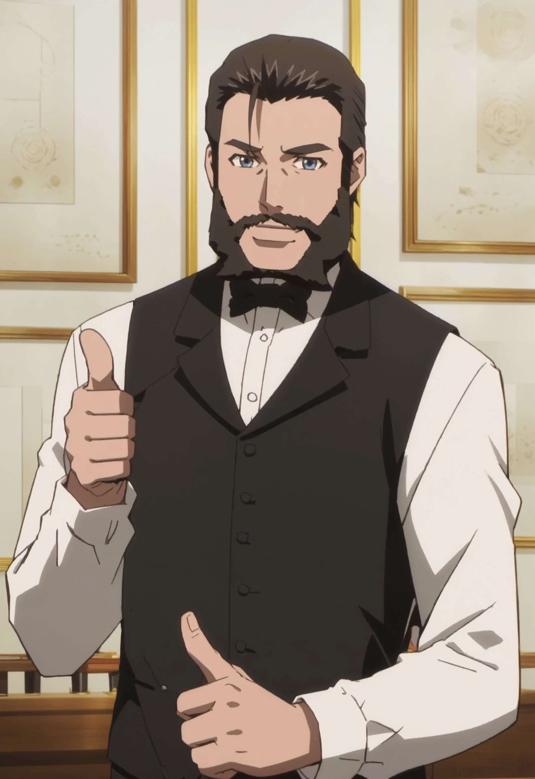 TTSGraham, facial hair, beard, black hair, bowtie, formal, shirt, vest, anime screencap