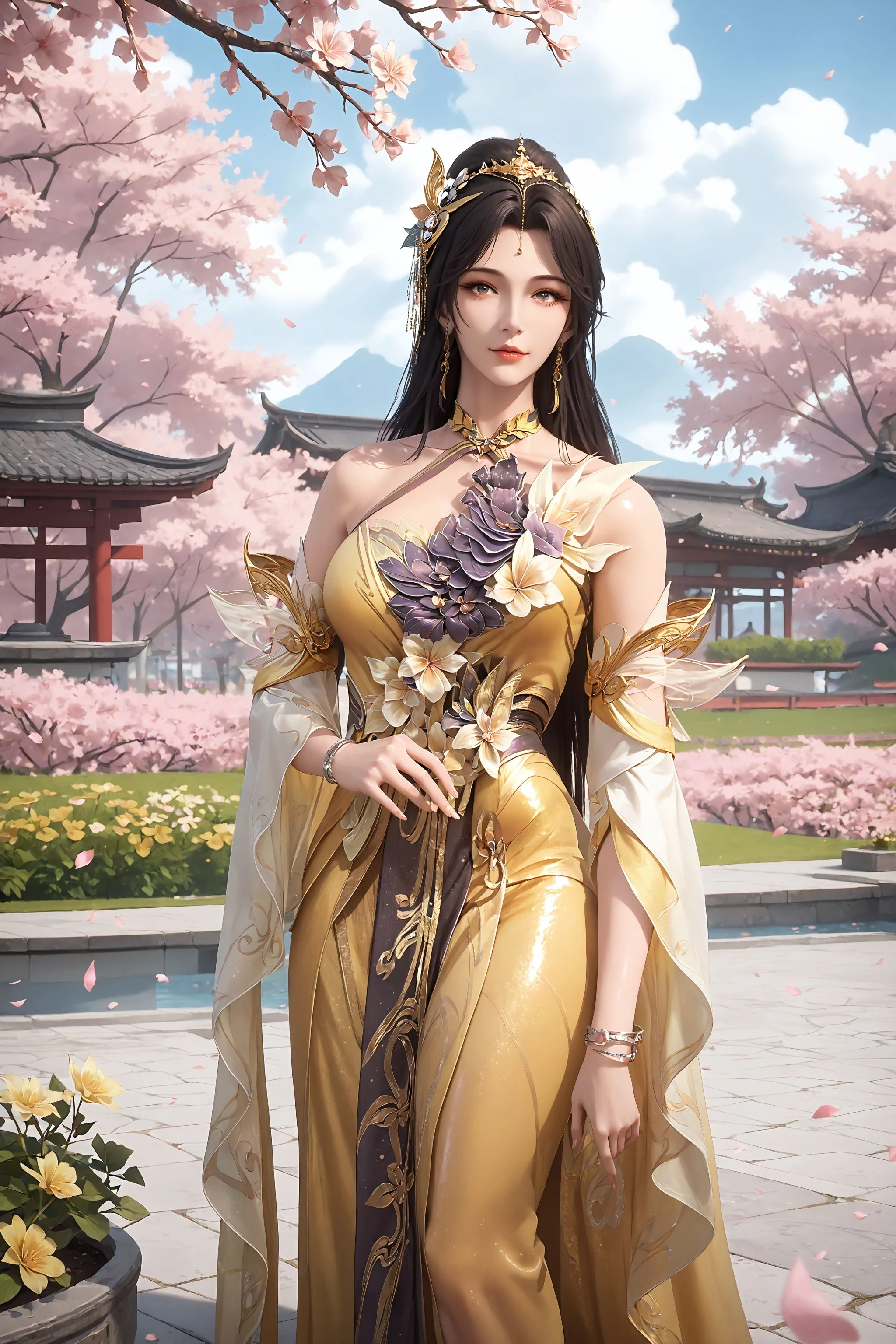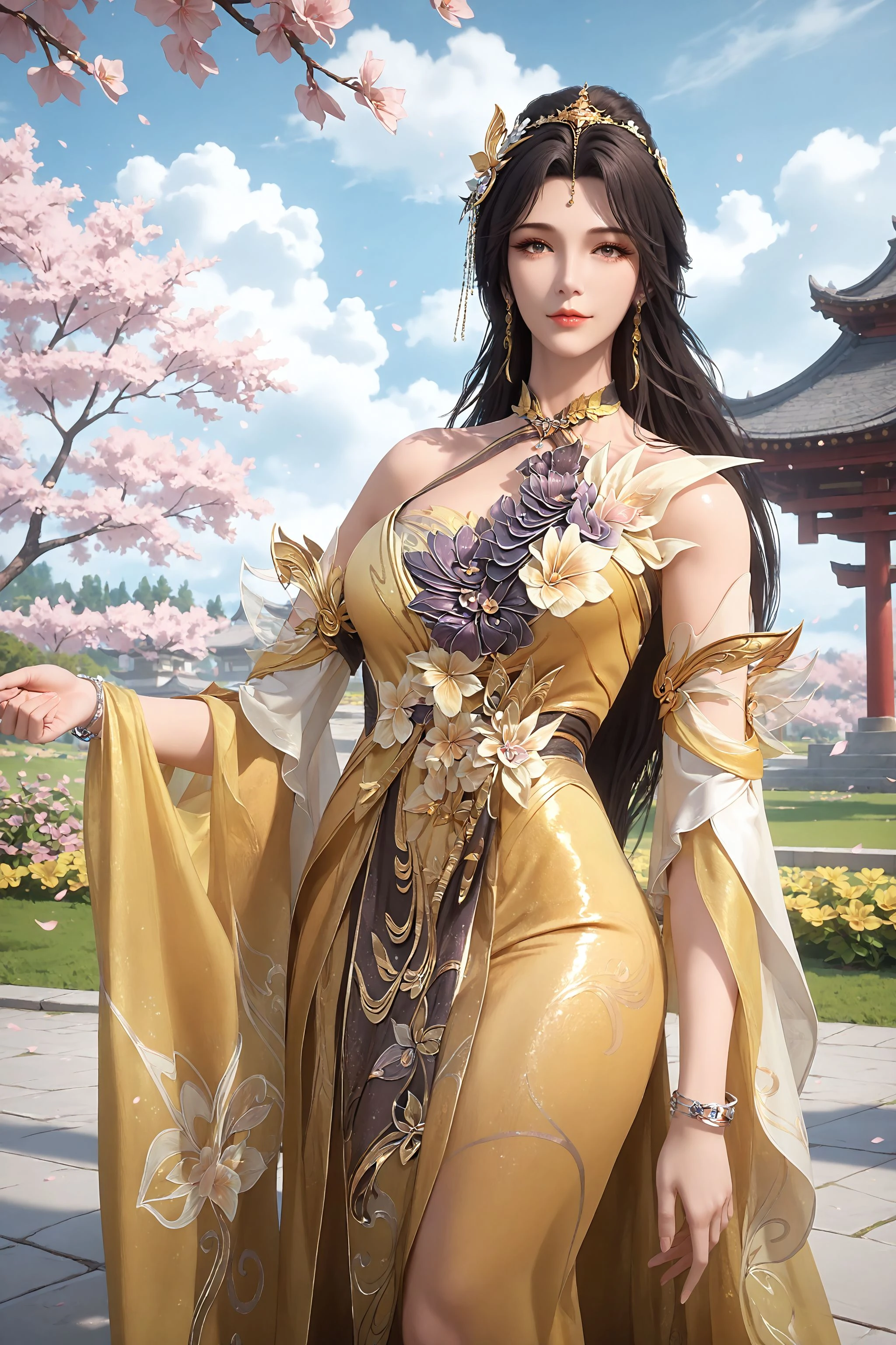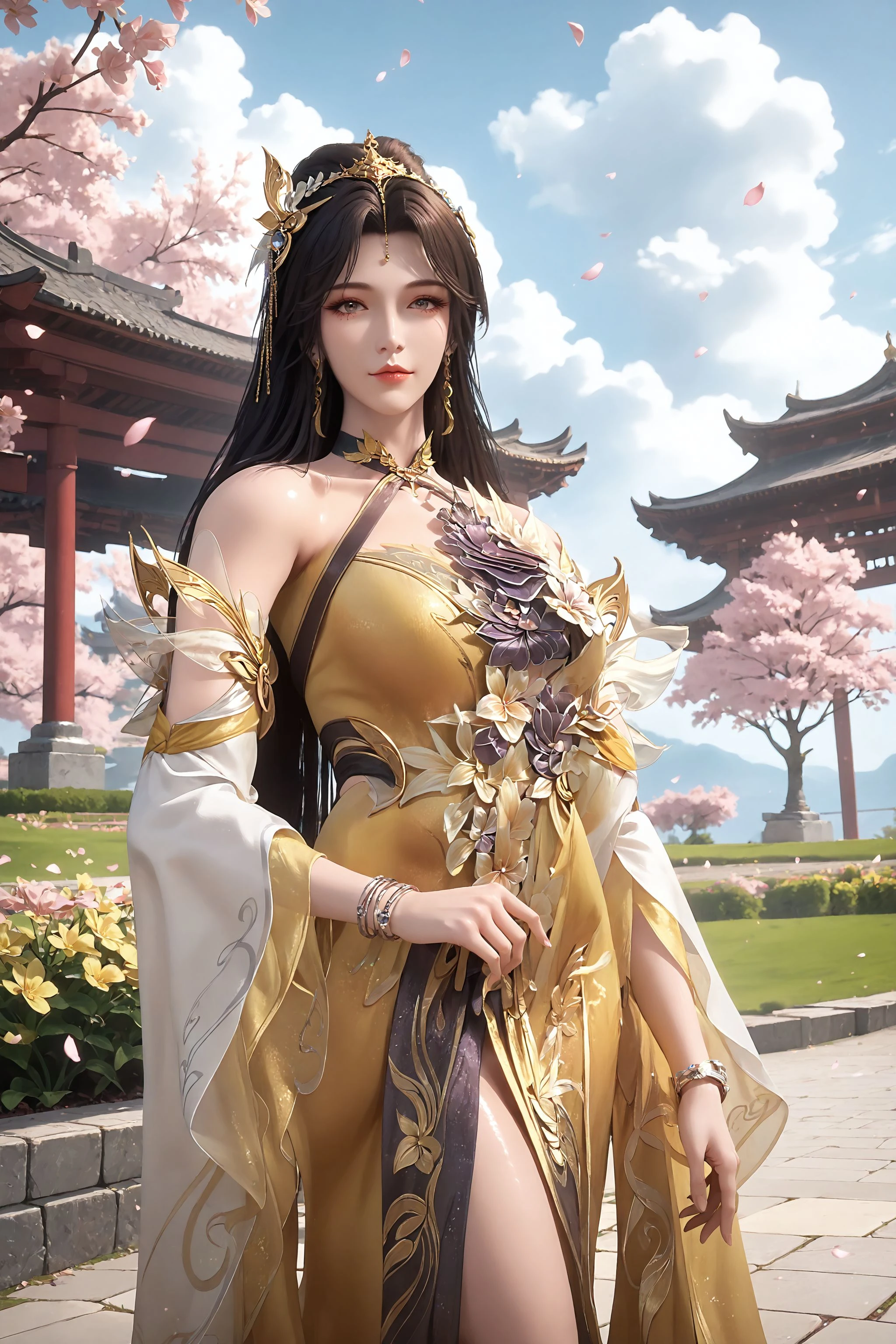1girl, dress, yellow dress, jewelry, solo, long hair, earrings, hair ornament, detached sleeves, bracelet, bare shoulders