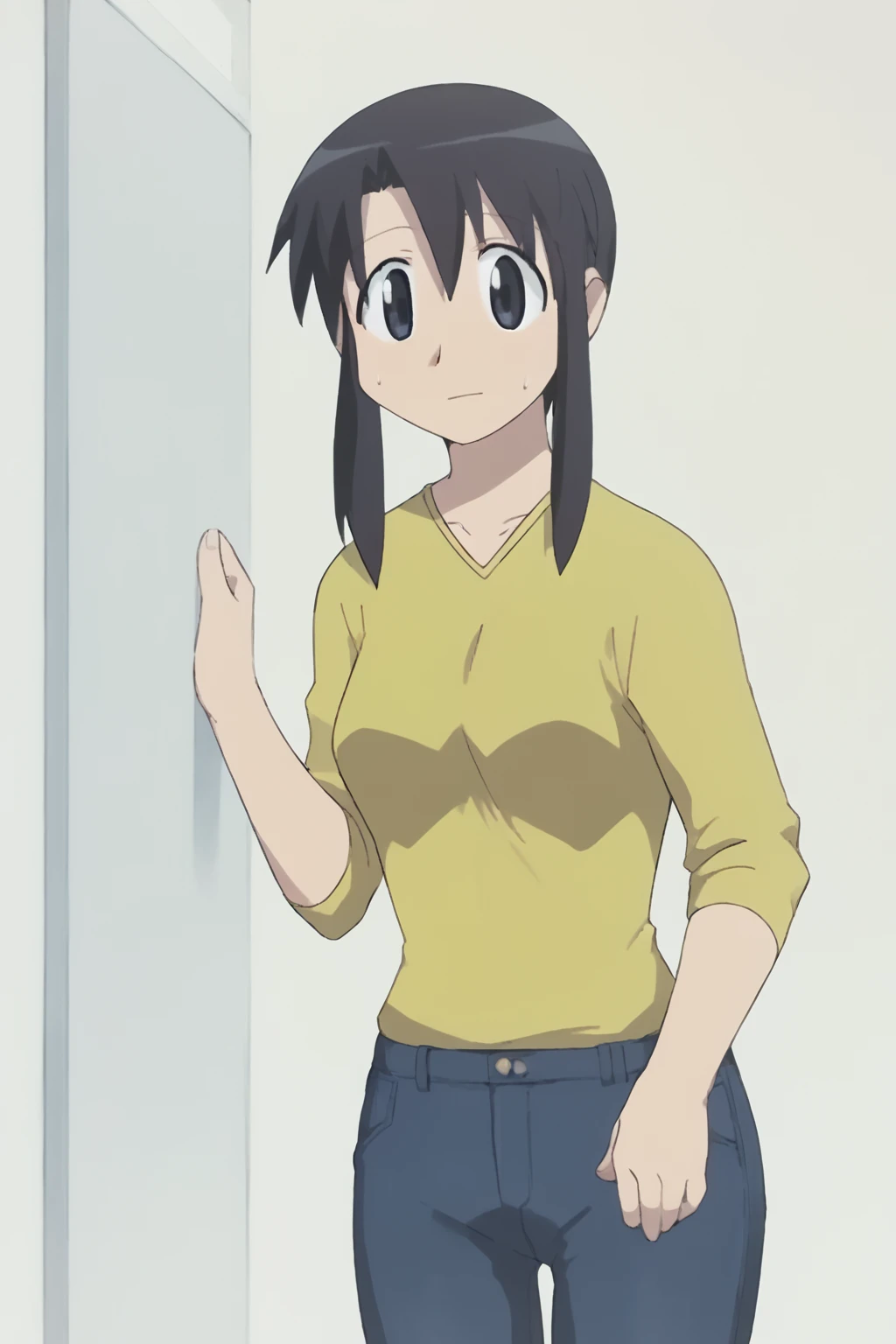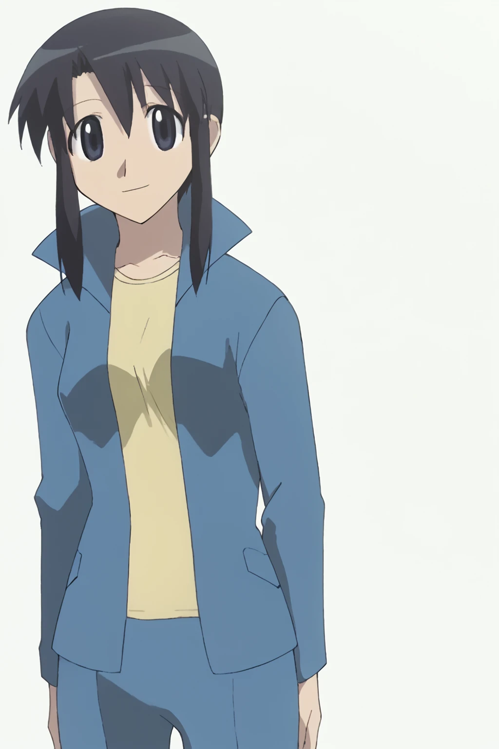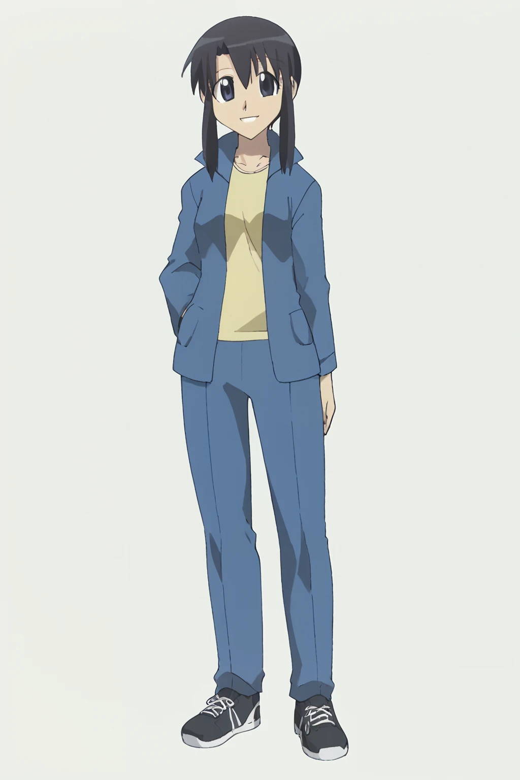 Blue jacket, yellow shirt, blue pants, black footwear, sneakers