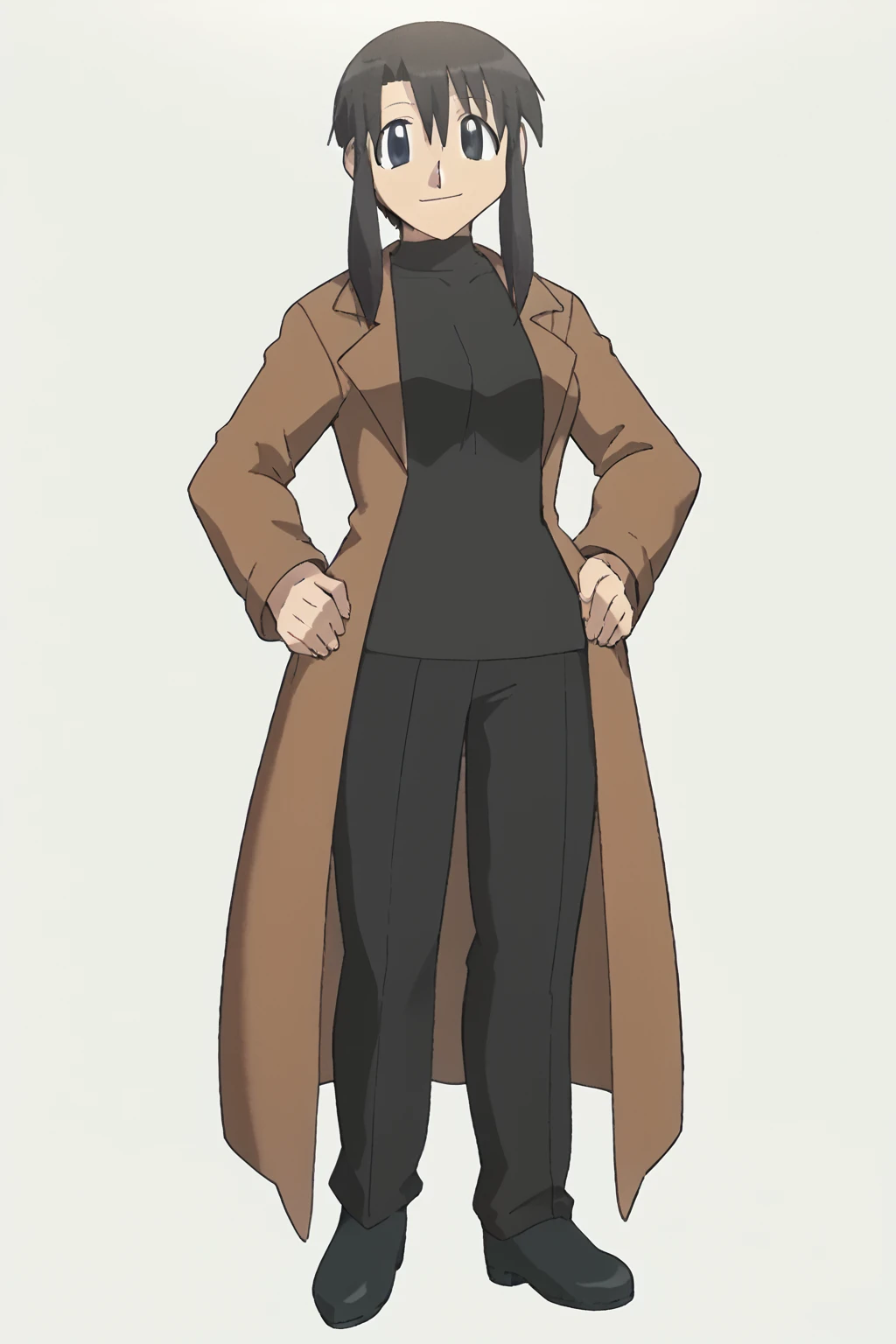 Brown coat, black shirt, turtleneck, black pants, black footwear