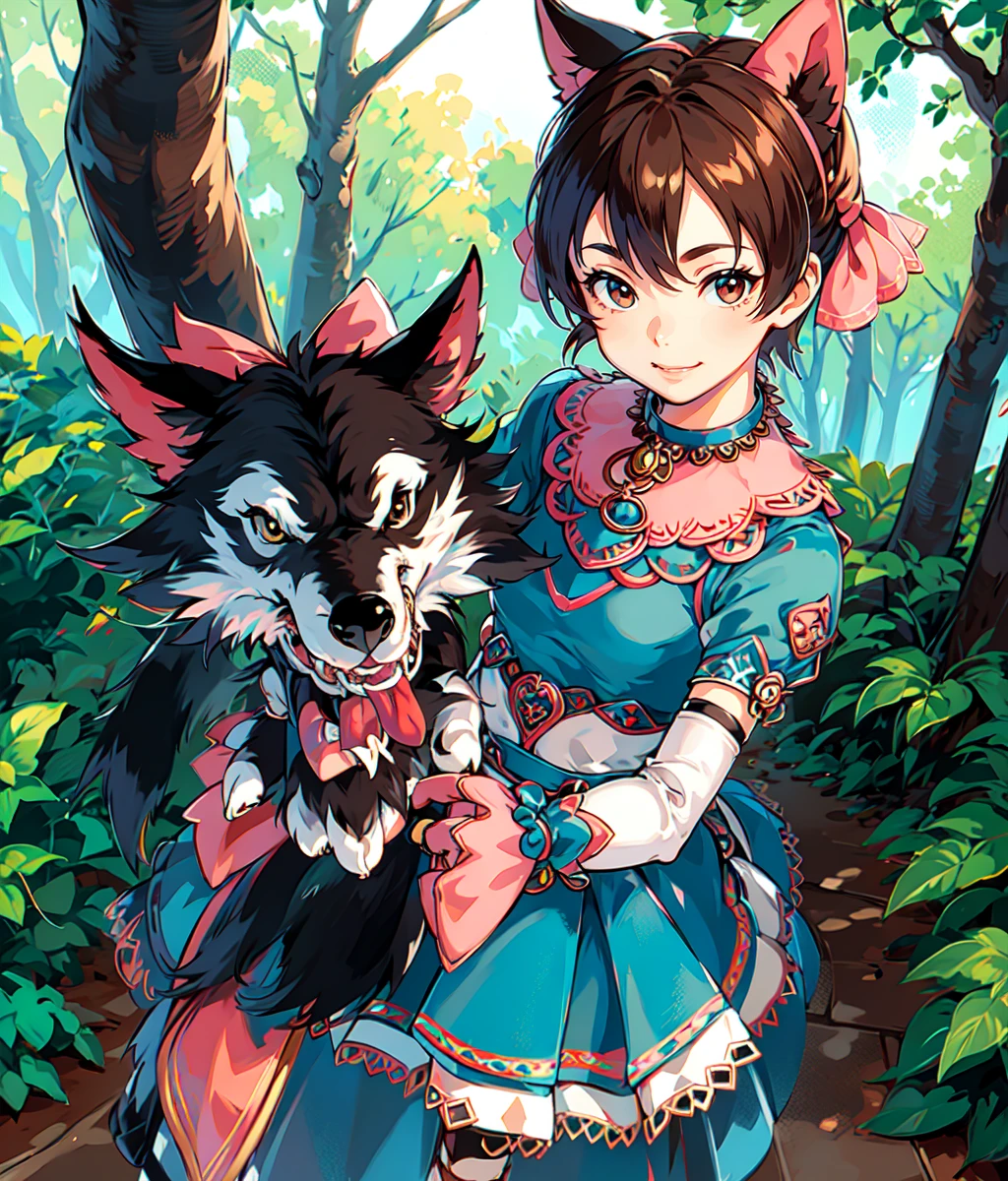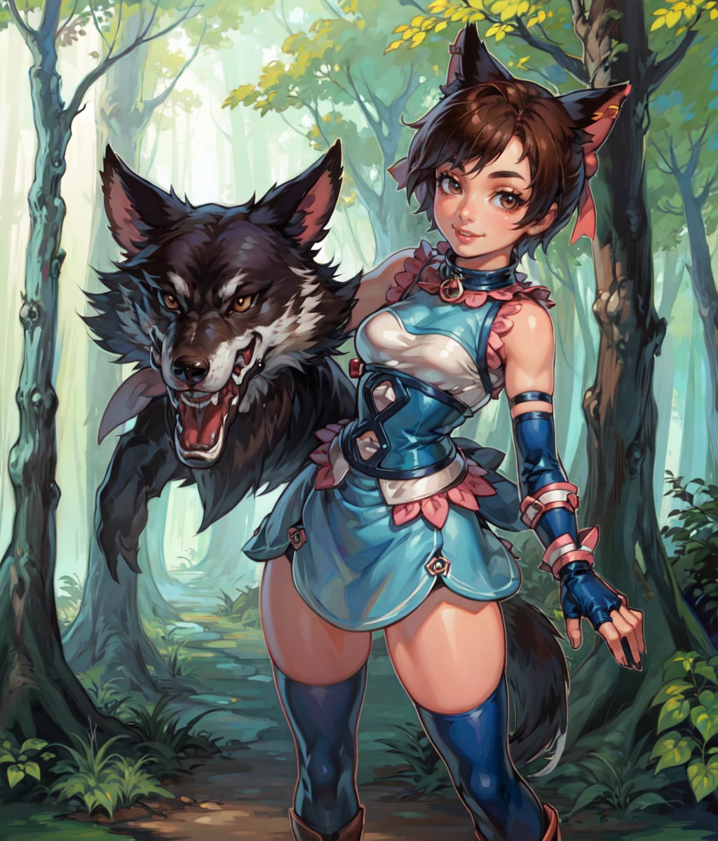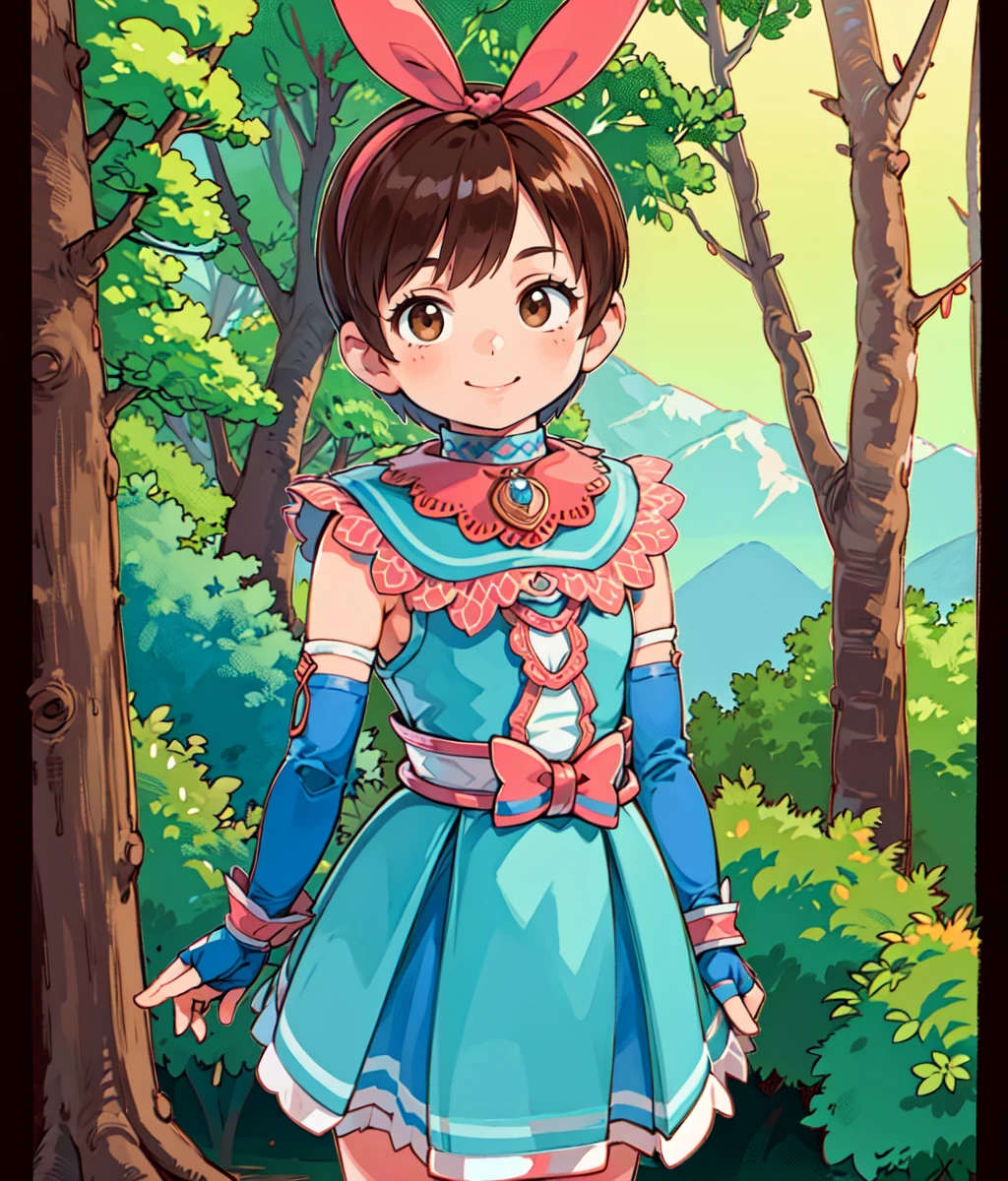 Notable tags: brown hair, brown eyes, short hair, giant pink ribbon on top of the head, high tighs, blue white outfit, blue elbow gloves, blue tighs, ring chocker,
