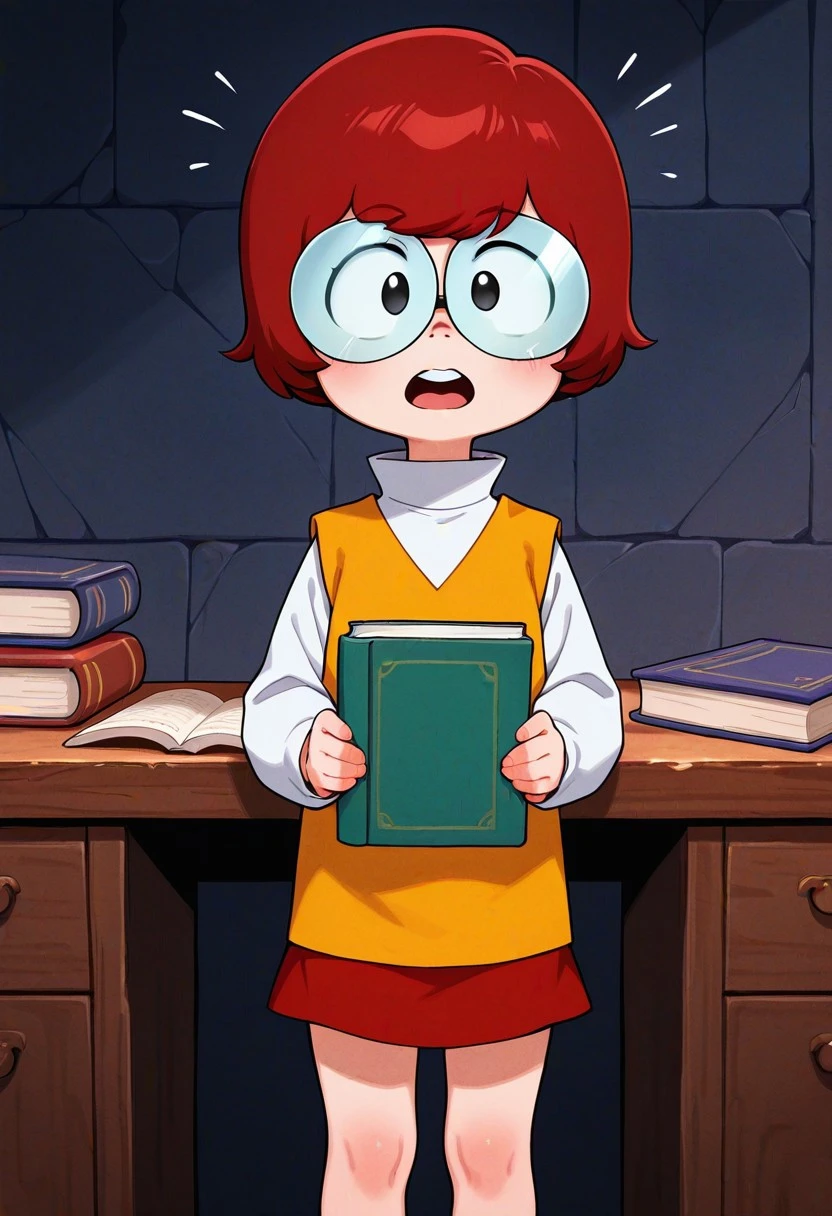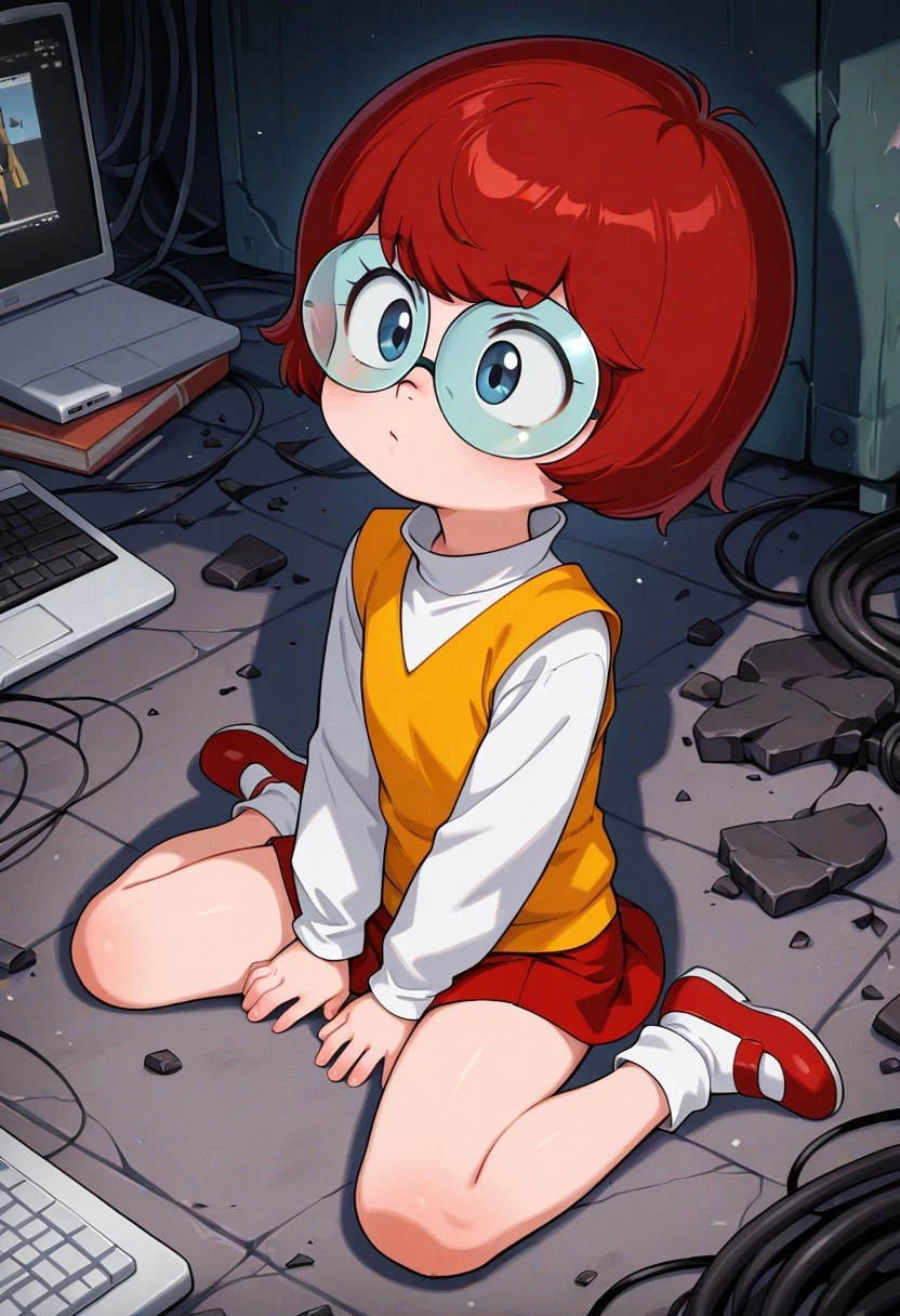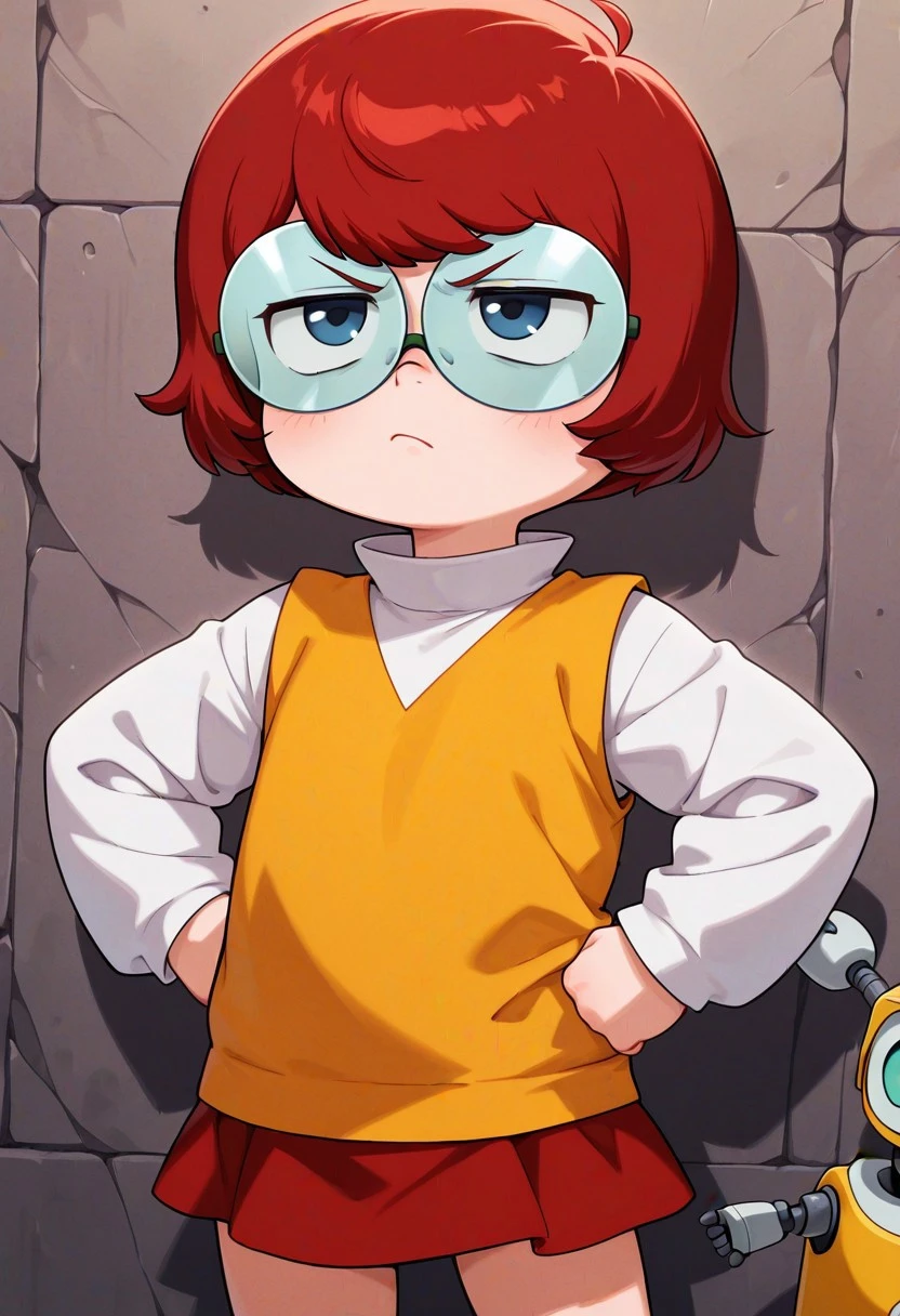 velma_pnsd, red hair, short hair, black eyes, round eyewear, vest, long sleeves, skirt