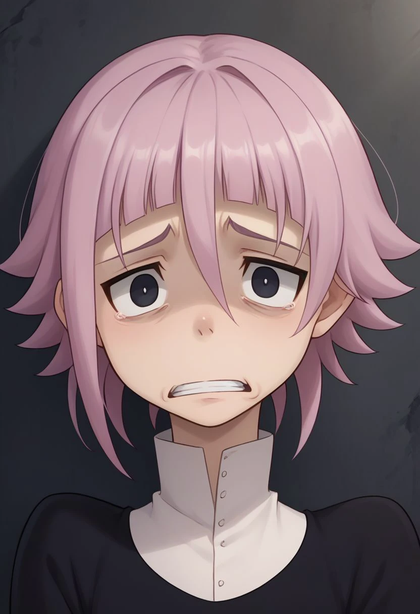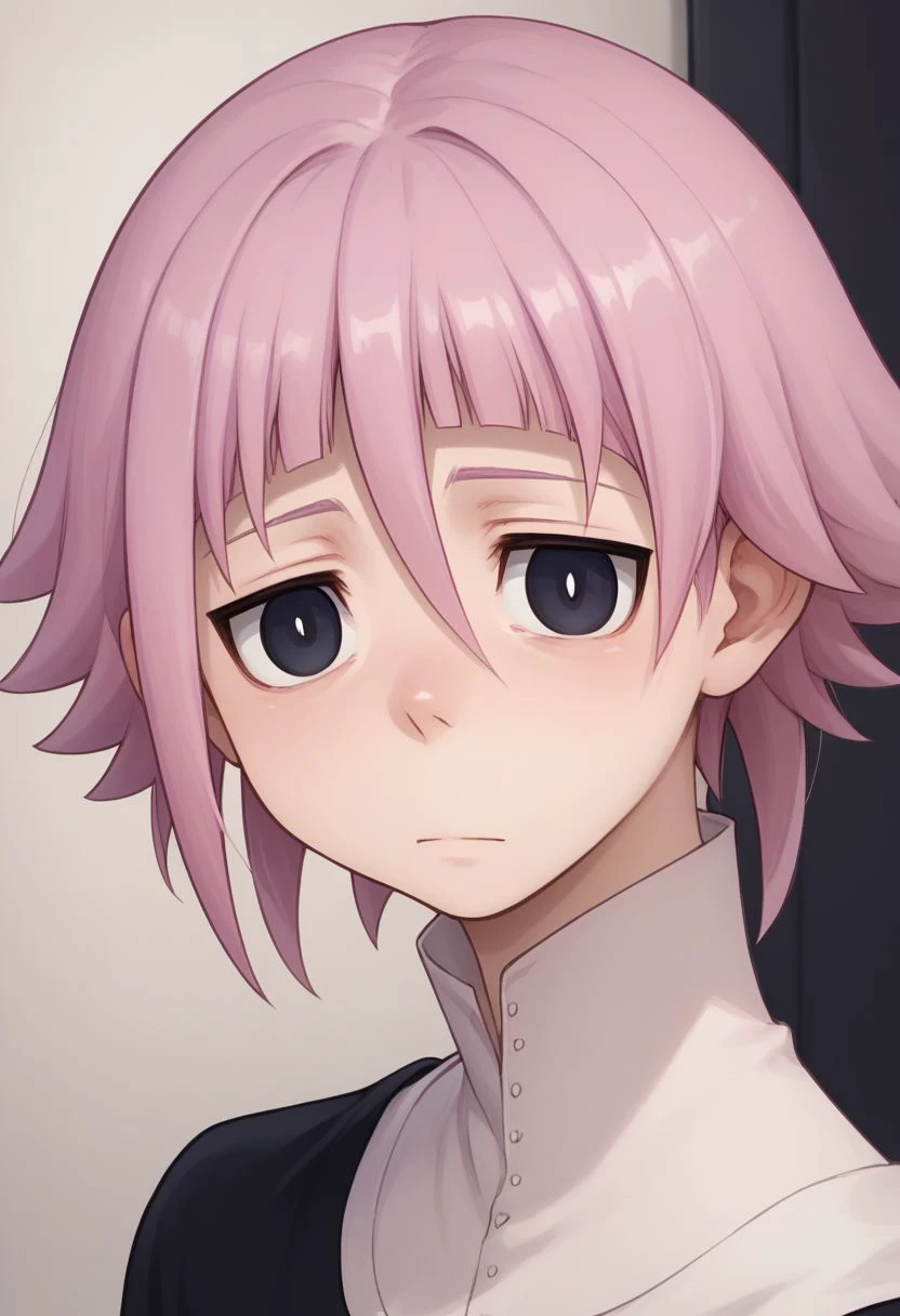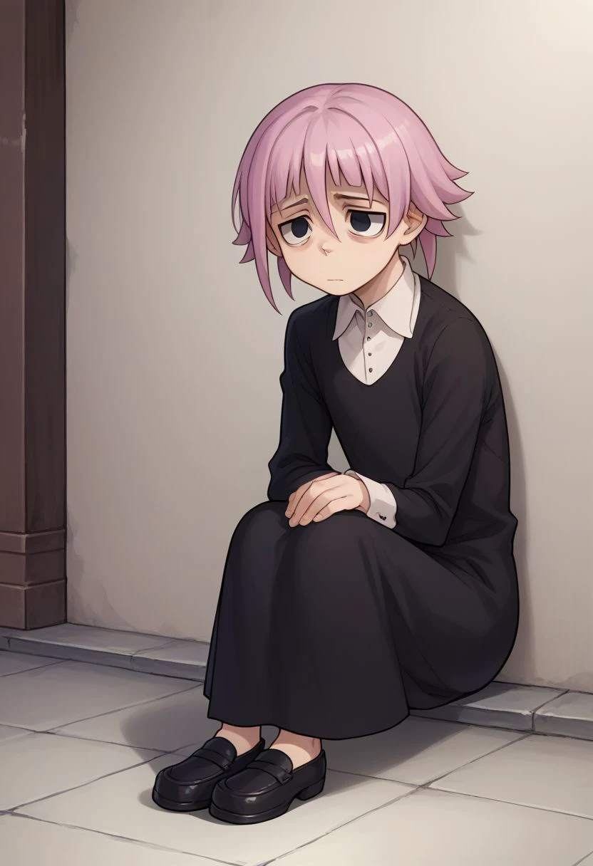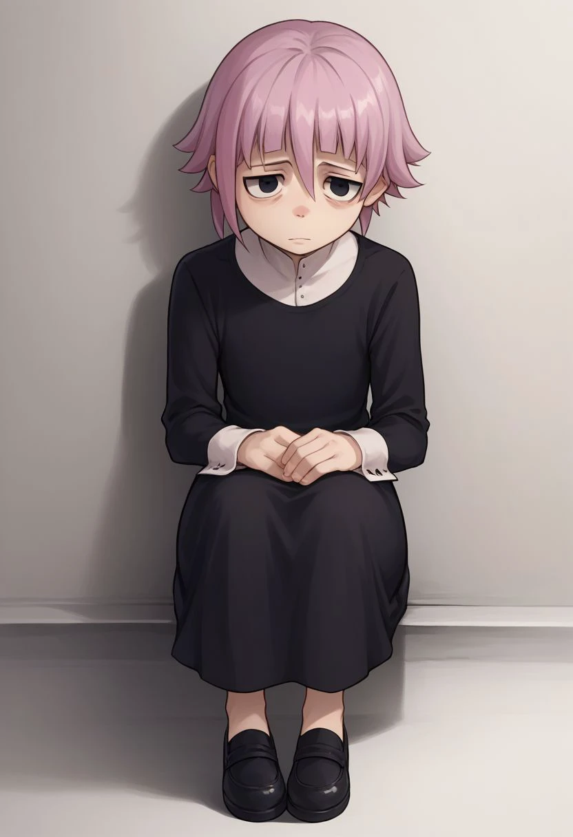 crona, 1boy, black eyes, short hair, pink hair, bags under eyes, hair between eyes, long sleeves, white shirt, shirt, dress, black dress, shoes,