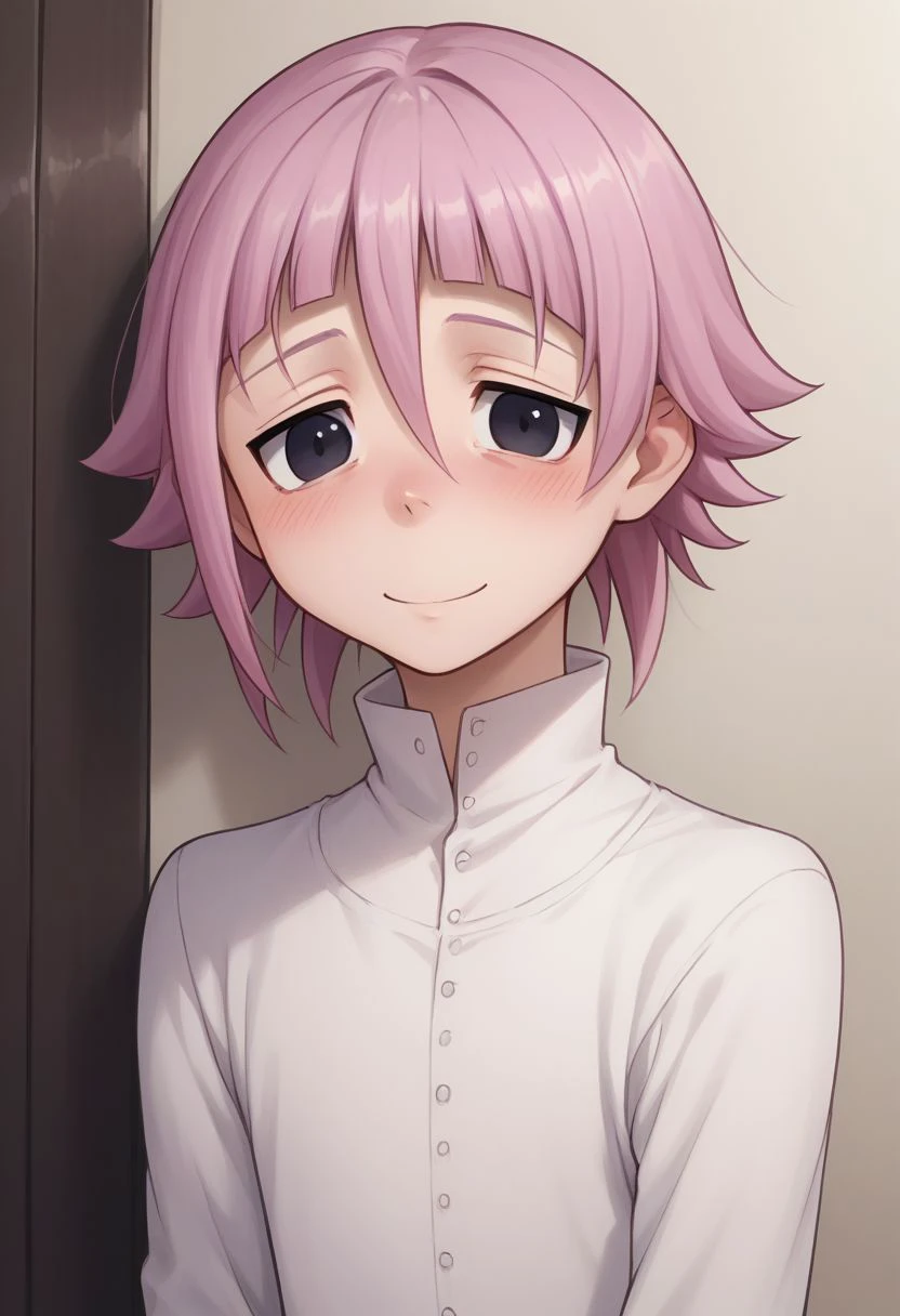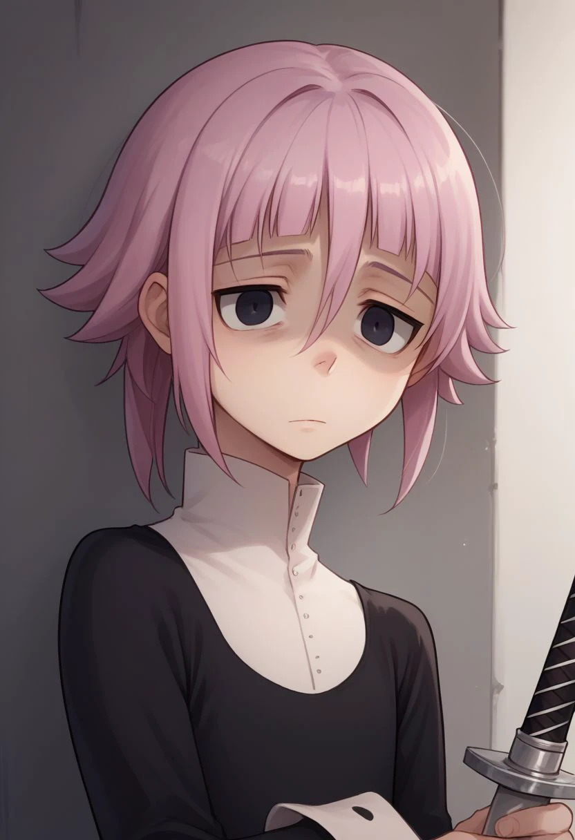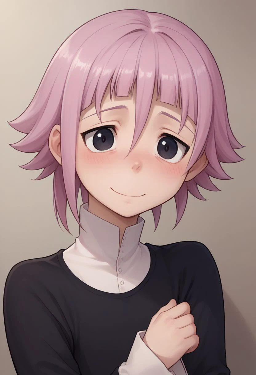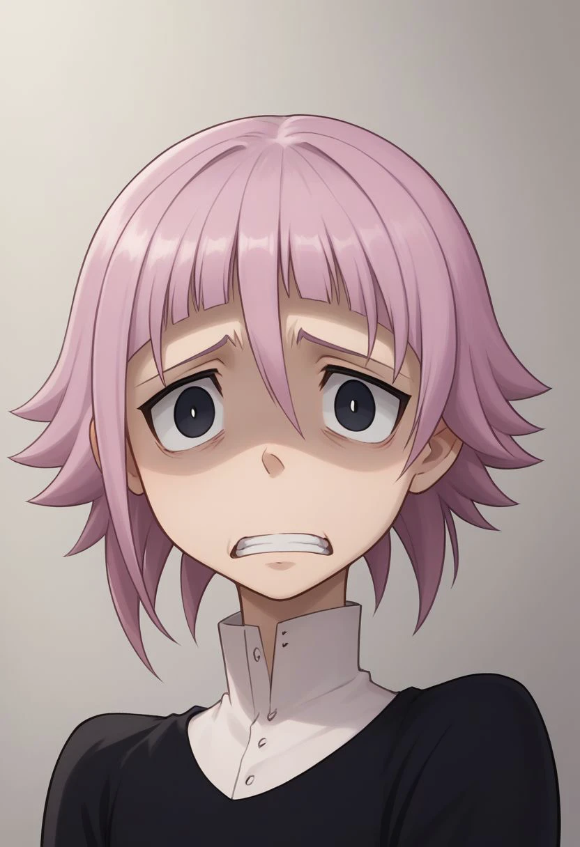 crona, 1boy, black eyes, short hair, pink hair, bags under eyes, hair between eyes, long sleeves, white shirt, shirt, dress, black dress, shoes,