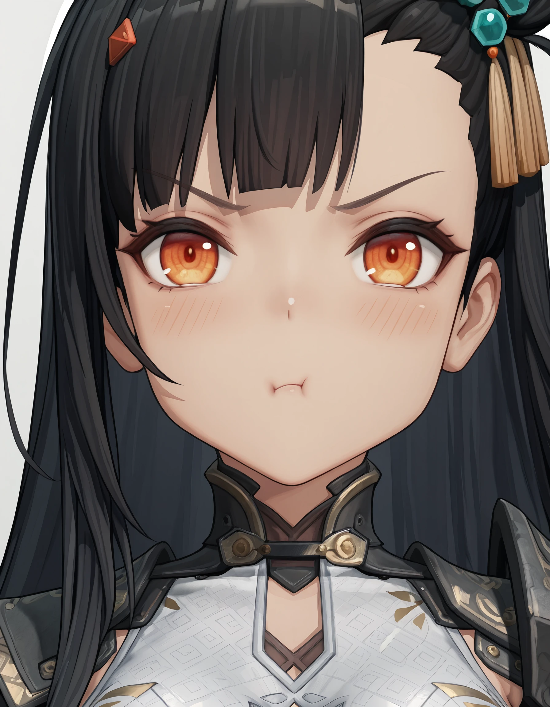 Trigger Words; qiongjiugf2,1girl,solo,black hair,long hair,orange eyes,arm armor,armor,asymmetrical legwear,belt,(black thighhighs),boots,chinese clothes,gloves,hair ornament,id card,knife,pauldrons,sheath,sheathed,shoulder armor,single pauldron,skindentation,Thigh belt,thigh strap,thighhighs,uneven legwear