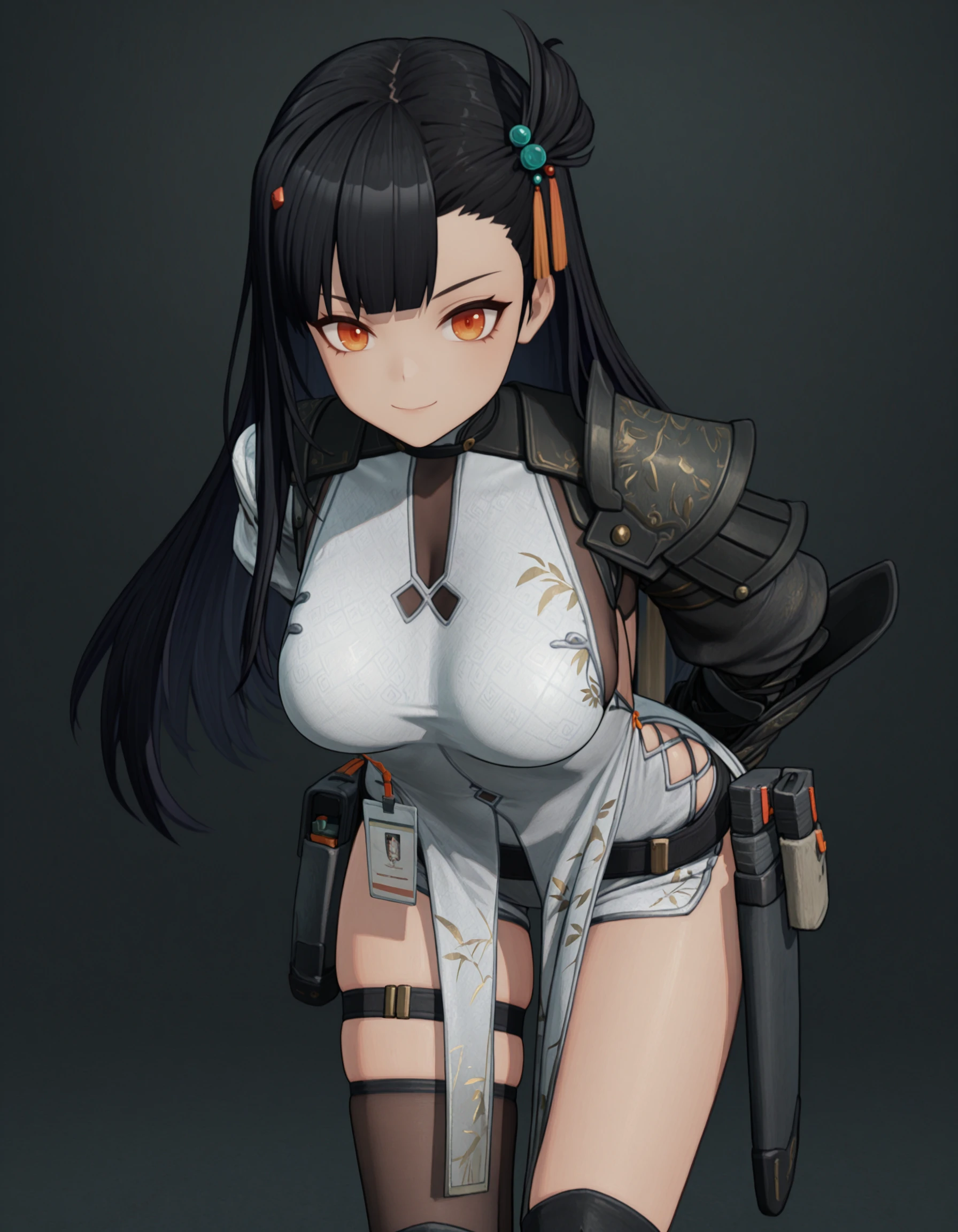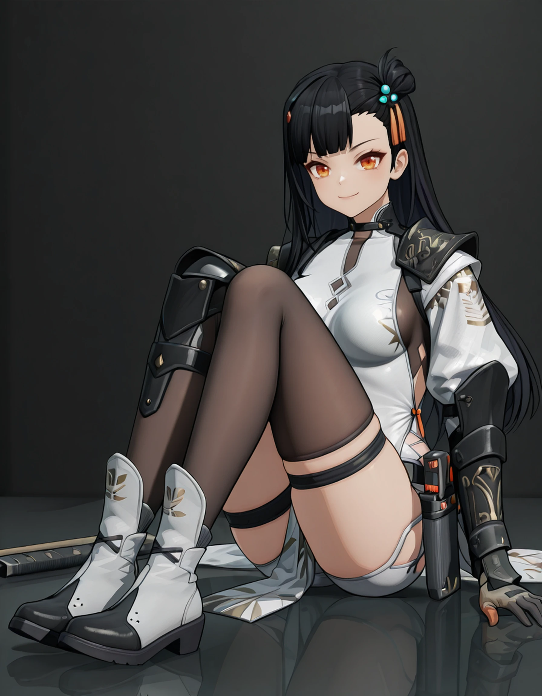 qiongjiugf2,1girl,solo,black hair,long hair,orange eyes,arm armor,armor,asymmetrical legwear,belt,(black thighhighs),boots,chinese clothes,gloves,hair ornament,id card,knife,pauldrons,sheath,sheathed,shoulder armor,single pauldron,skindentation,Thigh belt,thigh strap,thighhighs,uneven legwear
