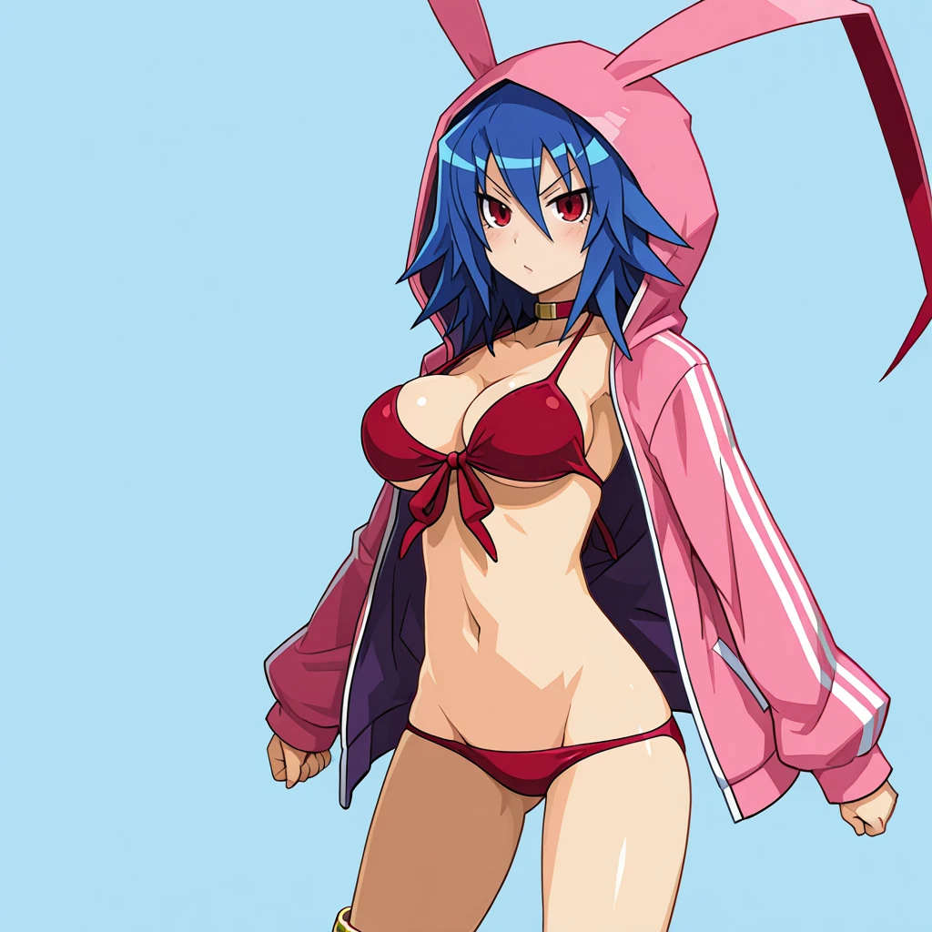 Trigger with jacket: LaharlChanBikini, 1girl, animal hood, blue hair, swimsuit, red bikini, red eyes, anklet, medium breasts, hoodie, jewelry, navel, cleavage, jacket, choker, front-tie top, groin, lowleg, open clothes, cowboy shot