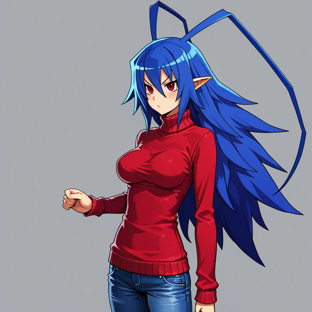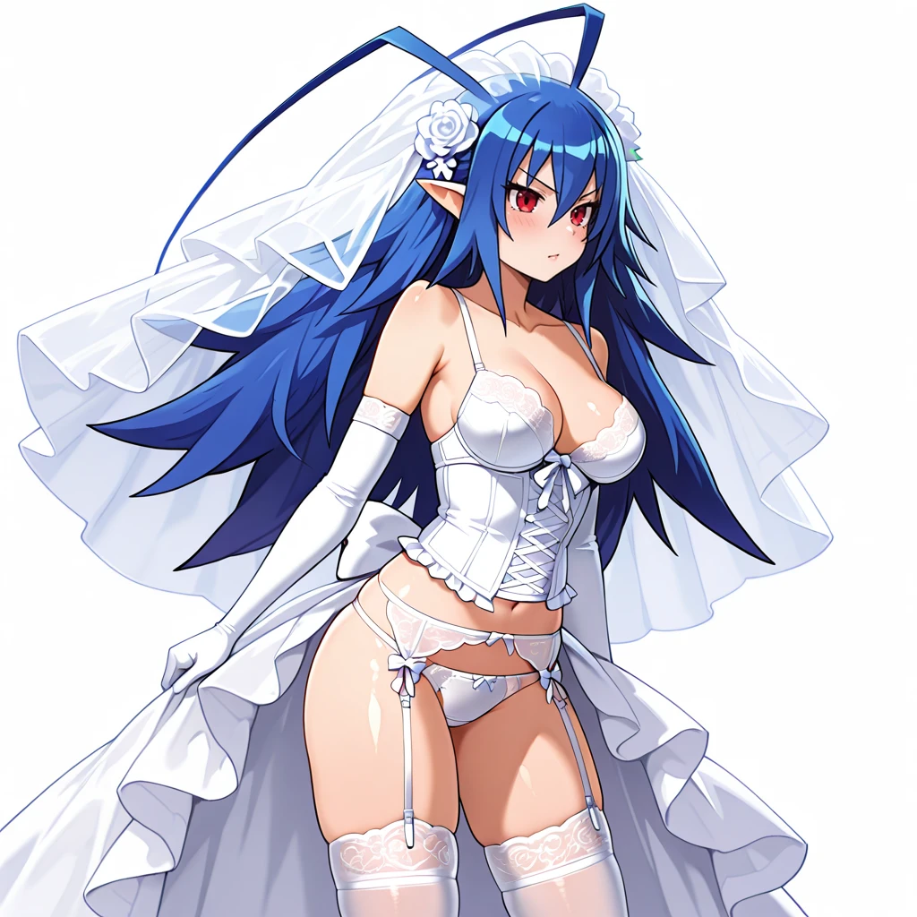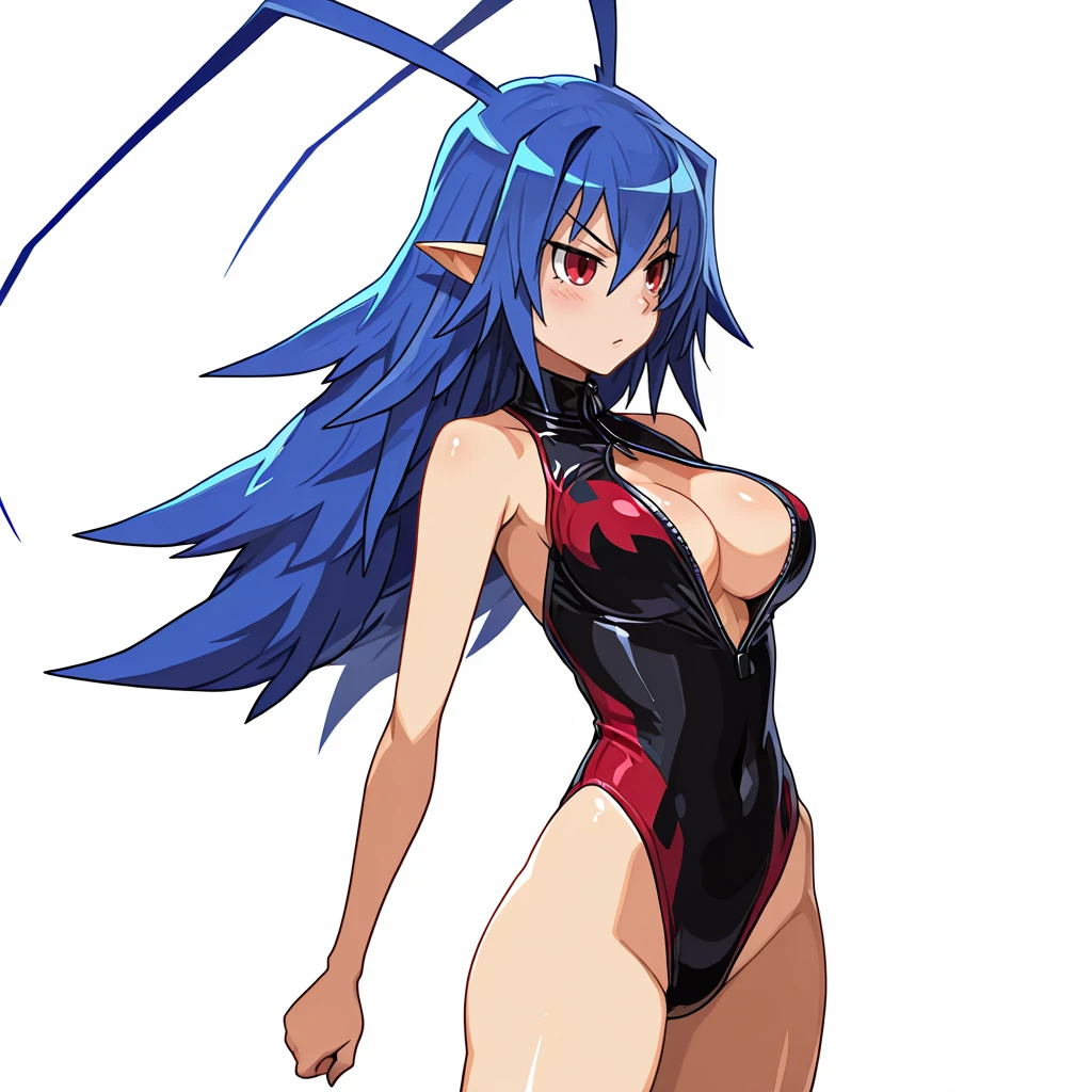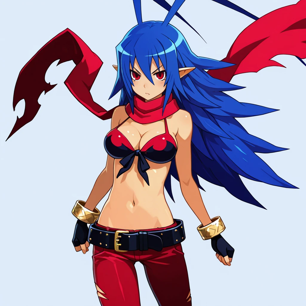 Trigger : LaharlChan, 1girl, long hair, pointy ears, scarf, antenna hair, swimsuit, red eyes, blue hair, medium breasts, belt, navel, pants, bracelet, fingerless gloves, cleavage, jewelry