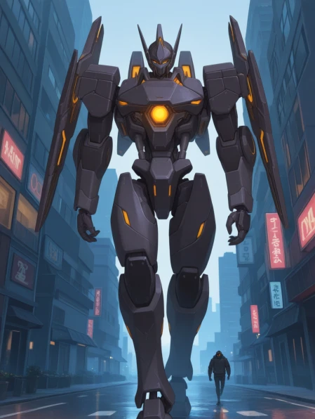 oghma, 1man, solo, robot, mecha, solo, science fiction, glowing, orange eyes,