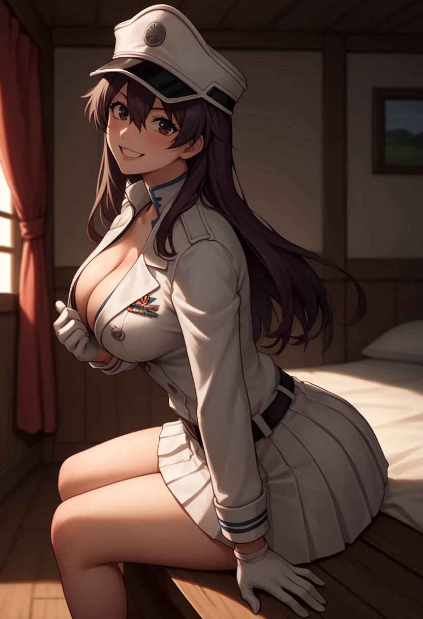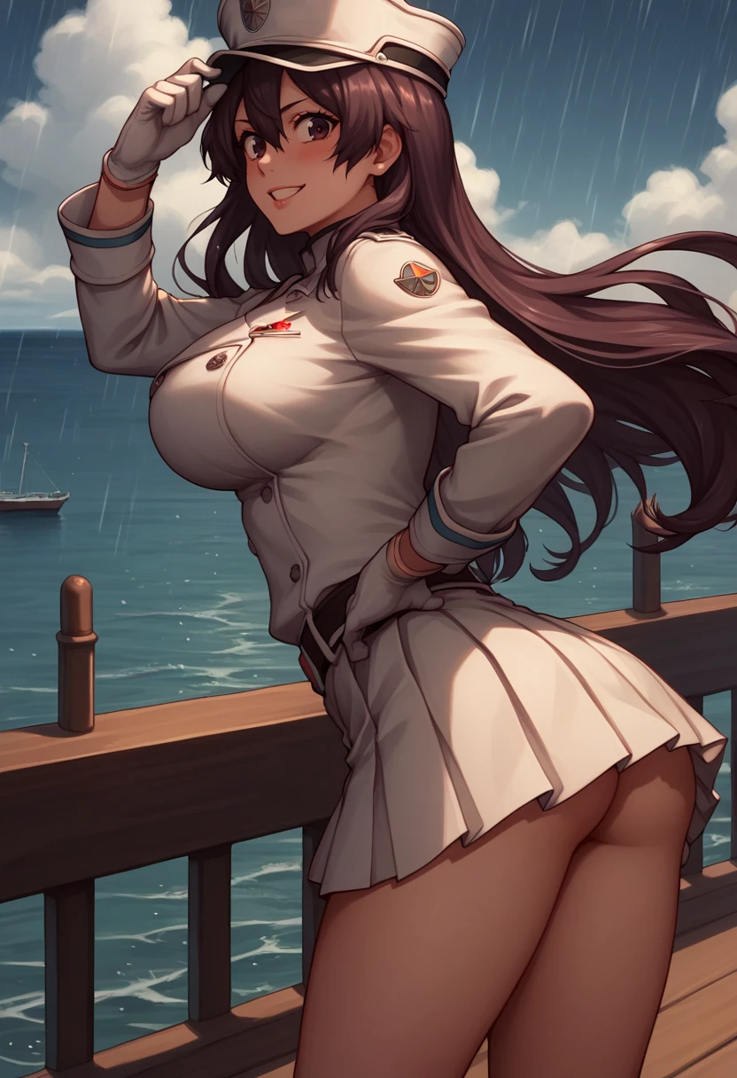 Outfit: ["basterb, brown hair, long hair, hair between eyes, brown eyes, peaked cap, white gloves, military uniform, white skirt, pleated skirt, double-breasted, white coat, long sleeves, belt"]