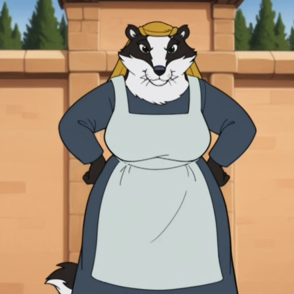 ConstanceRWil, semi-anthro, female-badger, black fur, black eyes, blue dress, white apron, yellow cap with yellow veil