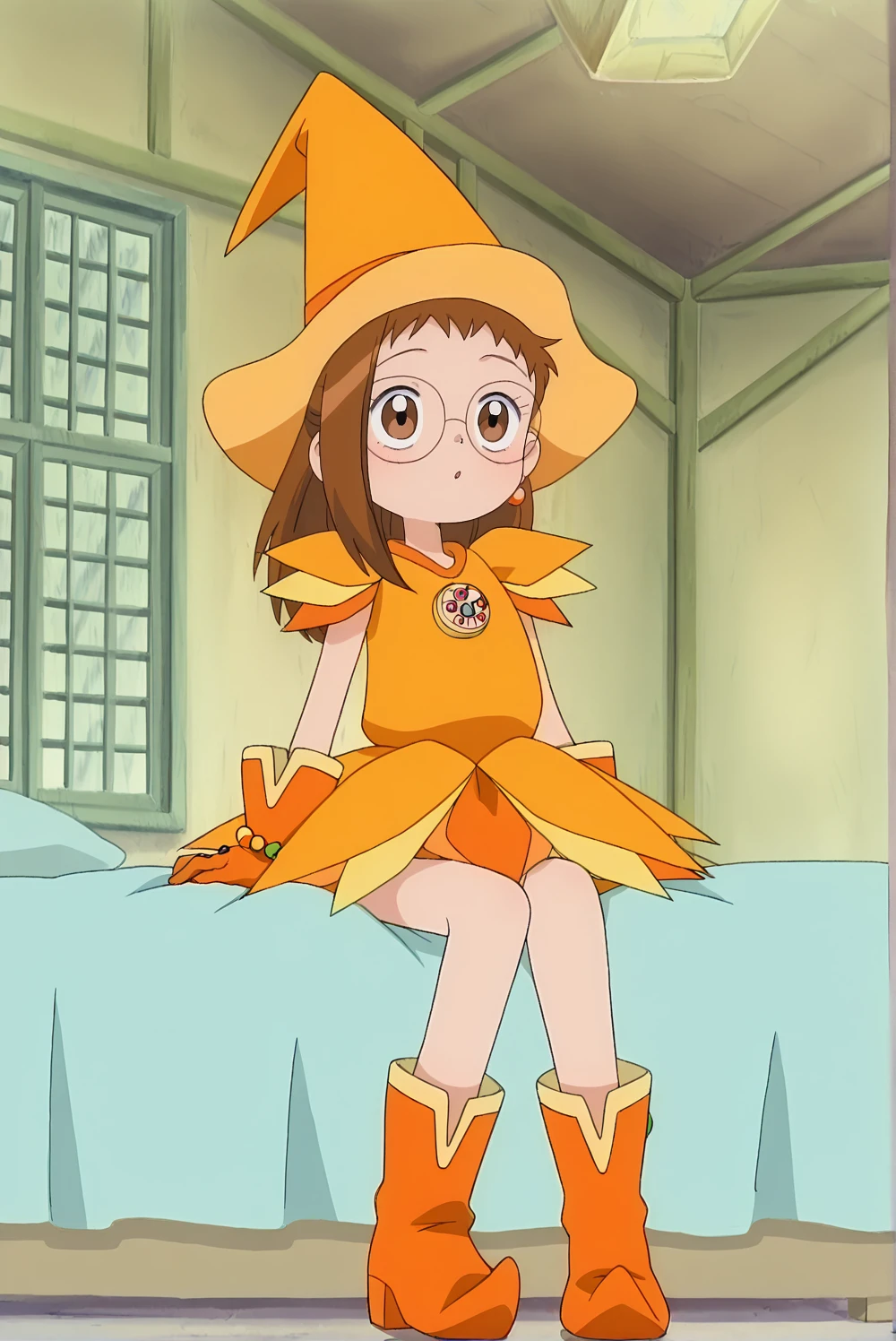 hazuki-fu, orange witch outfit, 1girl, brown hair, glasses, brown eyes, witch hat, puffy sleeves, petal skirt, gloves, boots, brooch, earrings