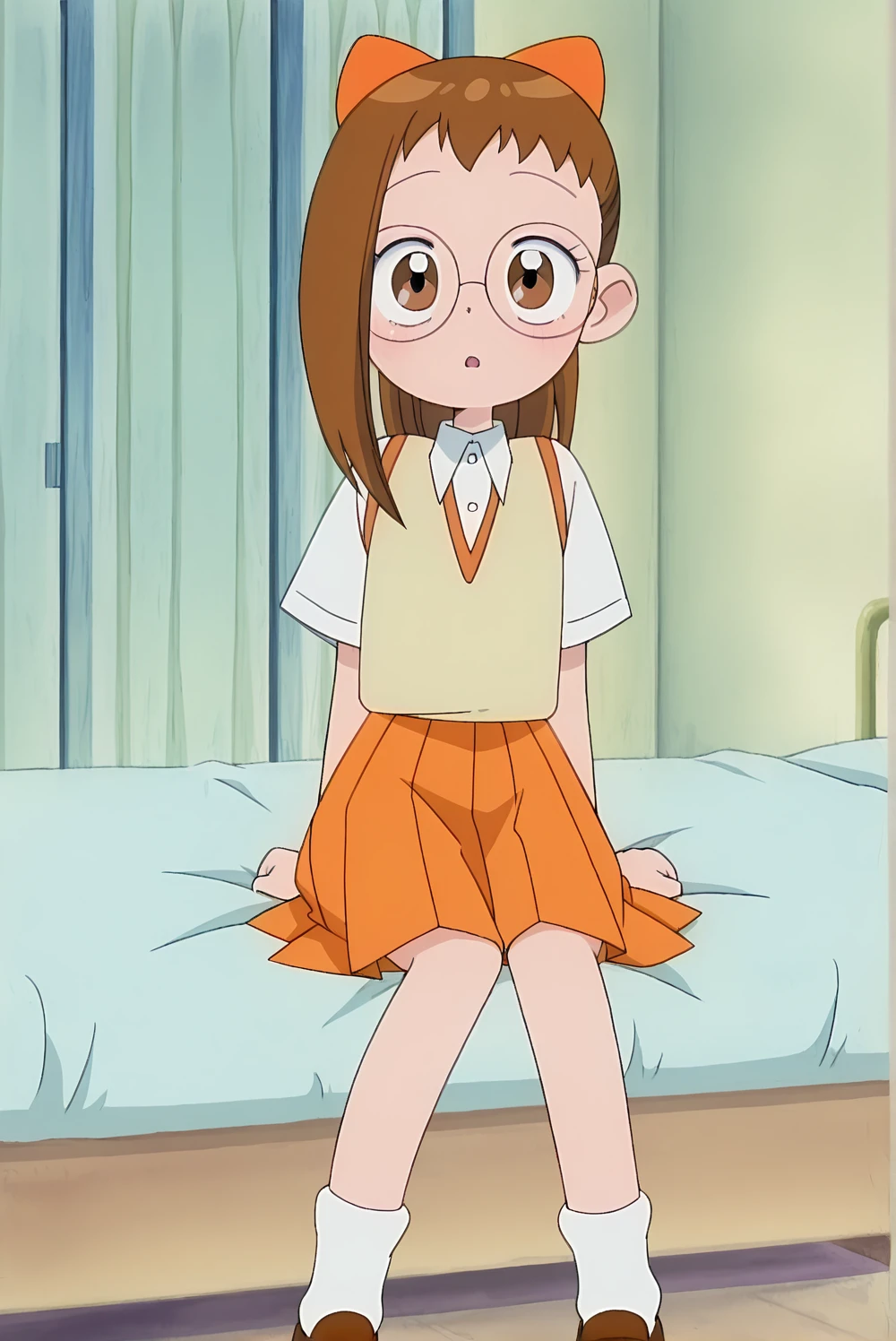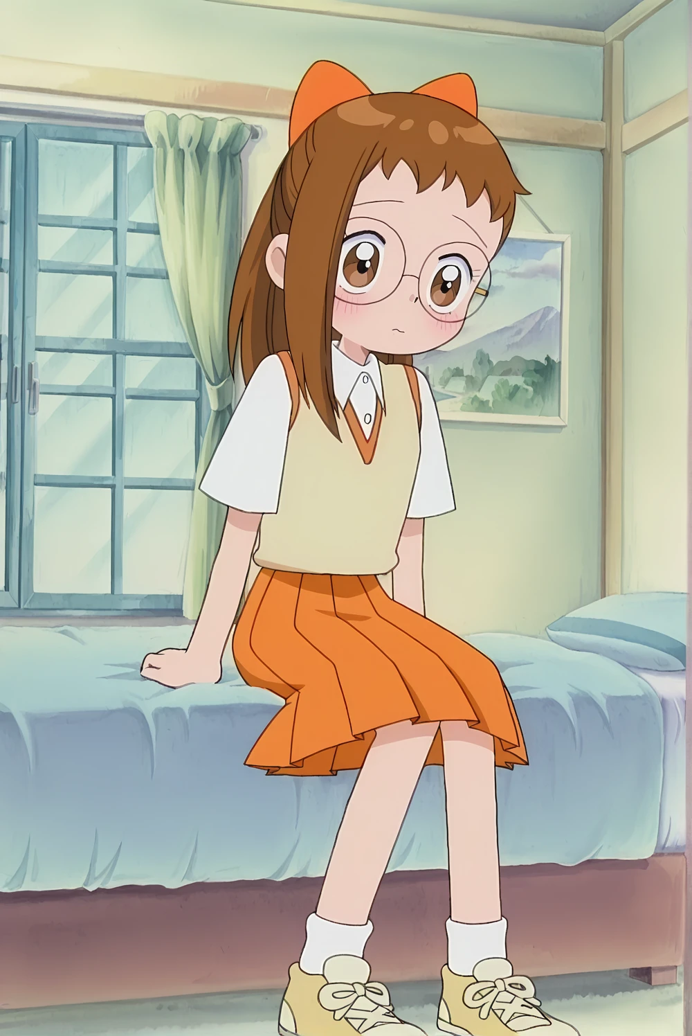 Casual: hazuki-fu, casual, 1girl, brown hair, glasses, brown eyes, hair bow, pony tail, white shirt, short sleeves, vest, orange skirt, pleated skirt, socks, shoes