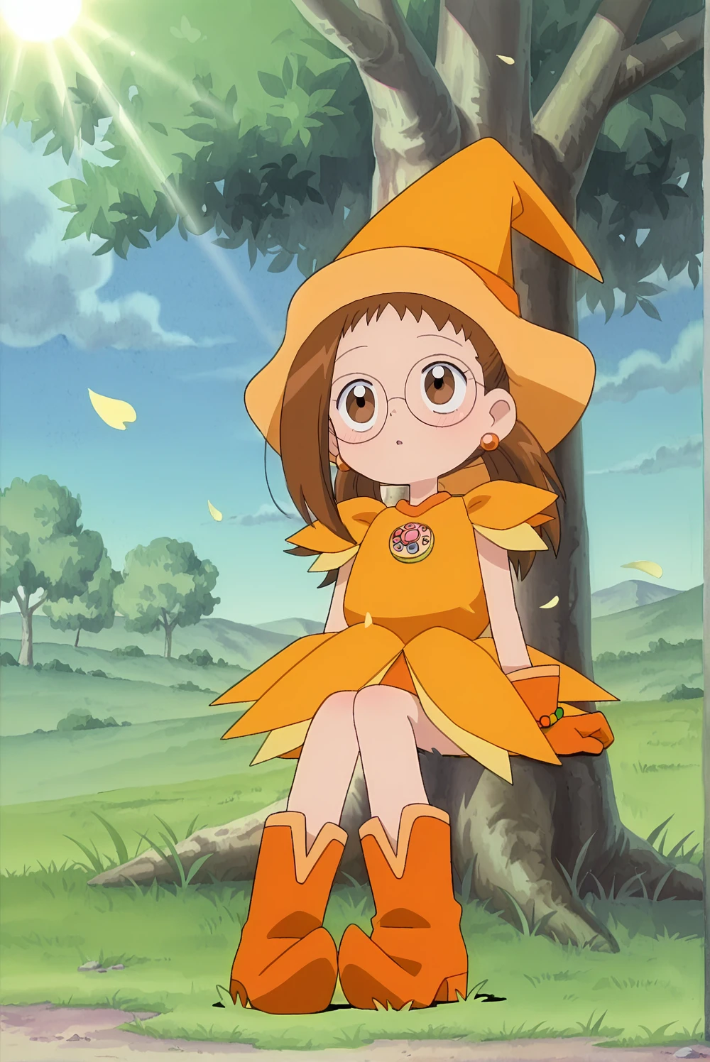 Witch: hazuki-fu, orange witch outfit, 1girl, brown hair, glasses, brown eyes, witch hat, puffy sleeves, petal skirt, gloves, boots, brooch, earrings