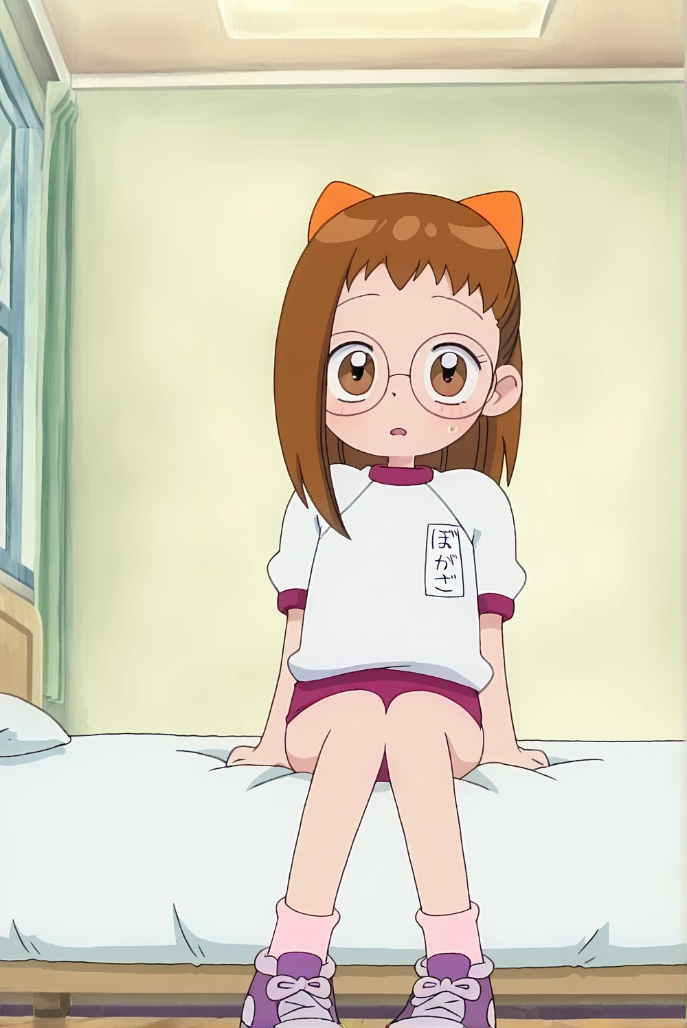 hazuki-fu, gym uniform, 1girl, brown hair, glasses, brown eyes, hair bow, white shirt, white shirt with magenta accents, short sleeves, magenta buruma, pink socks, nametag, purple sneakers