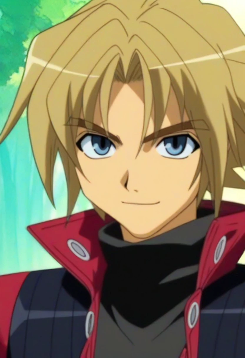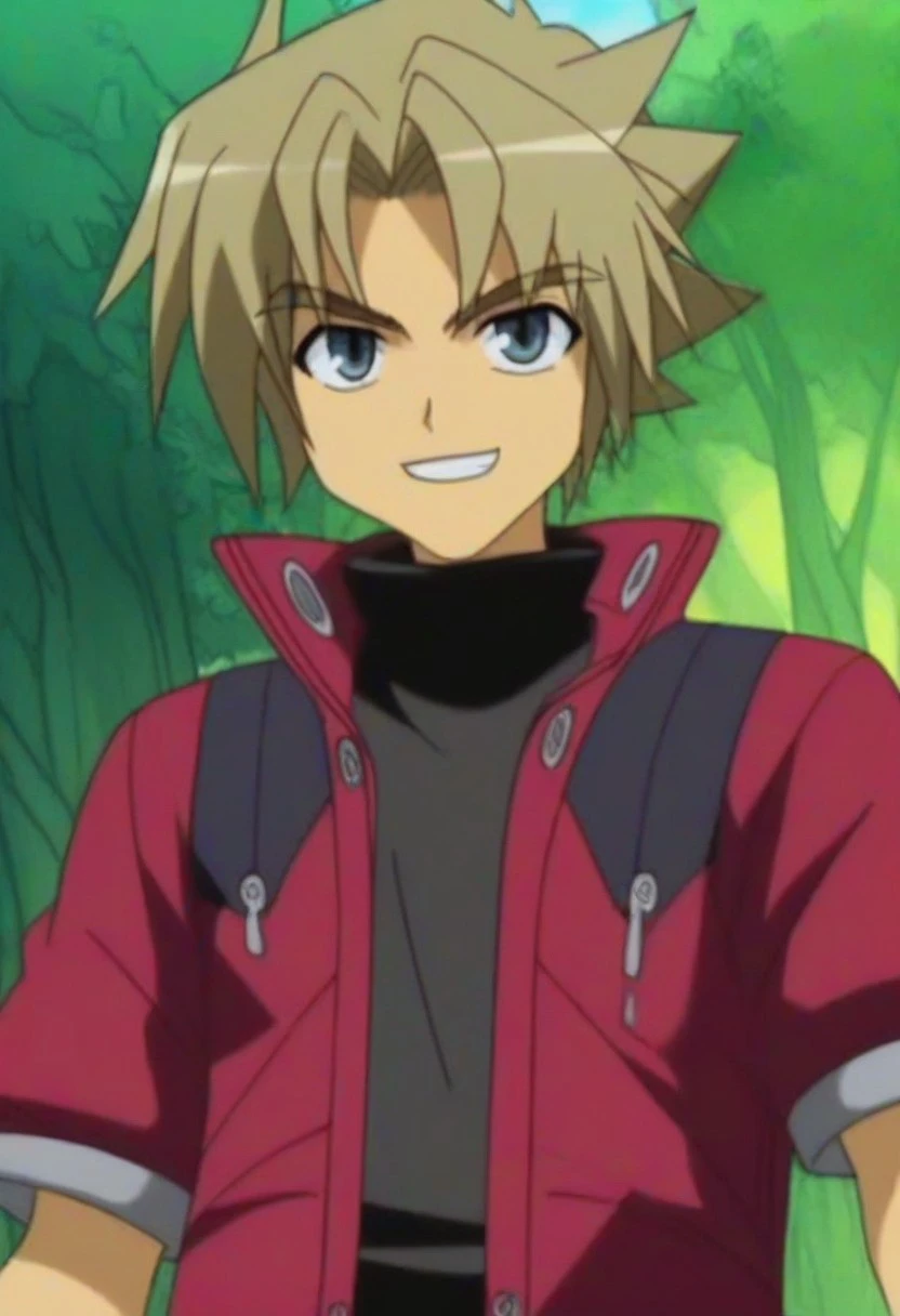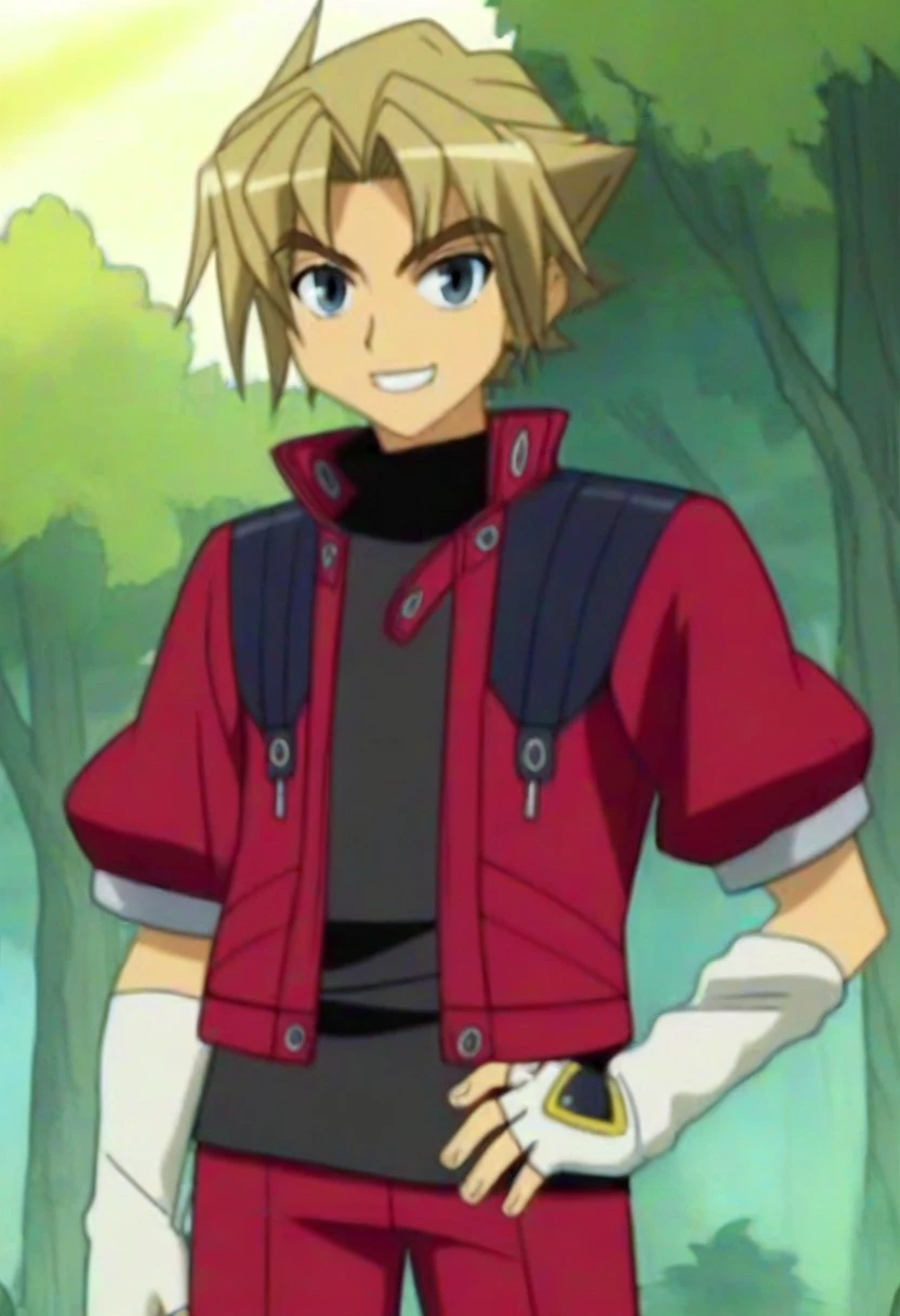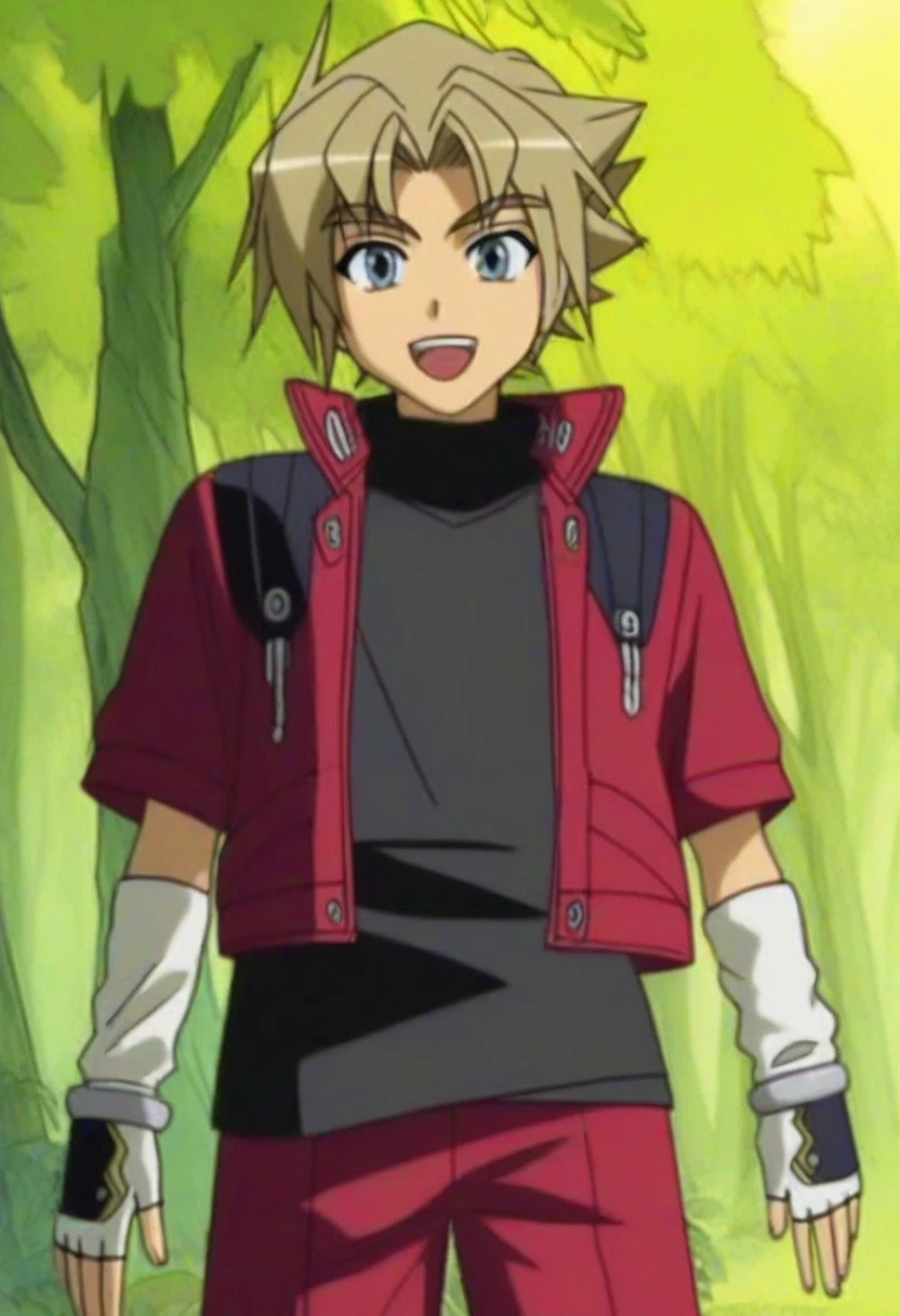 Coud Van Giruet, blonde-brown hair, split bangs, dark blue eyes, black turtleneck shirt, red jacket, open jacket, short sleeves, arm warmers, fingerless gloves, red pants, thigh straps, black boots